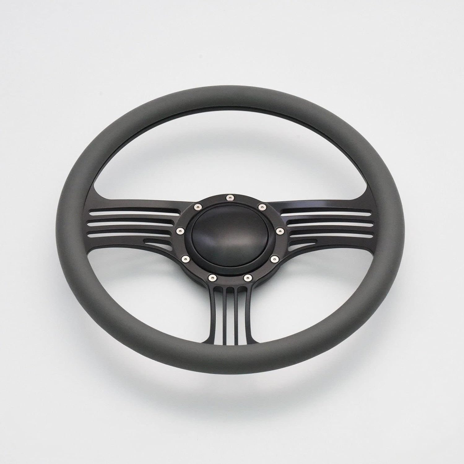 This billet steering wheel is 14-inch in diameter, with a 2-inch dish; it is milled from a whole piece of aluminum 6061, assembled with half wrap covered by high quality wrapped which provides an extraordinary smoothness and comfort. The surface has a black anodized finish that well fits interior designs of vehicles. We also provide a default horn button along with the steering wheel, included in price, and can be changed with any other horn buttons available in our shop. There are 7 colors (White, Burgundy, Black, Light grey, Red, Dark grey, and Tan) for this steering wheel as well as walnut wood half wraps. The 9-bolts design is able to fit most 9-bolts adapters in the market, otherwise we also offer compatible adapters that do fit most columns.