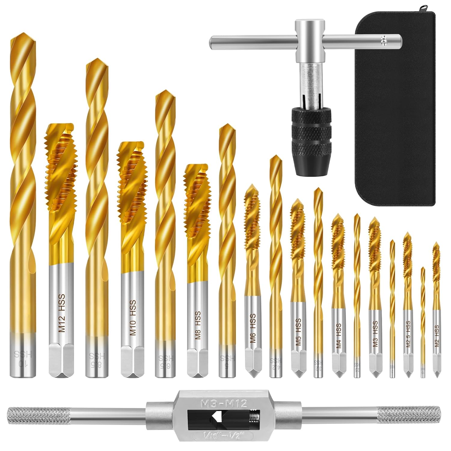 • 【COMPREHENSIVE SIZE RANGE】 Our metric tap set includes: 21 metric tap (sizes from M2 to M12: M2, M2.5, M3, M4, M5, M6, M8, M10, M12, SAE: 6-32NC, 8-32NC, 10-24NC, 10-32NC, 12-24 NC, 1/4-20NC), 9 high-precision drill bits (1.5, 2, 2.5, 3.2, 4.2, 5, 6.5, 8.5, 10) and 1 1/4 inch hex quick release bit holder. The tap wrench is suitable for taps M3-M12, and the T handle tap wrench is suitable for taps M3-M8. 1 storage bag. Please refer to the images for detailed product dimensions.