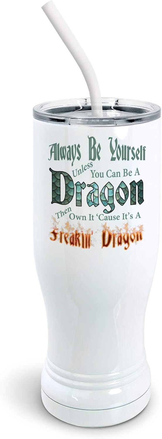 Why not express yourself with a design on an insulated tumbler tailored especially for you?You are always told to be yourself, despite what others say. What if you could be a dragon? Doesn't that sound fun? This insulated cup is perfect for any nerd that loves dragons and other mystical creatures. Fire breathing, high flying dragons are awesome! Agree? Maybe you need a new insulated travel mug to add to your geeky collection?No More Tacky Stickers!Your double-wall, vacuum insulated tumbler is permanently printed on both sides using the studio-grade professional sublimation process. This dye transfer process embeds the image into the surface for a lifetime and will not wash off, fade away, peel, chip, or crack unlike other methods.Quality ConstructionMade with 18% Chromium/8% Nickel stainless steel, your tumbler cup is crafted with a seamless interior to eliminate the potential for rust or stains. Their vacuum insulation keeps your drink hot or cold for hours and will not sweat like many non-insulated travel mugs.Put Your Mind at EaseWe made your life easier with a splash-proof BPA-free slider lid for less spills and a silicone straw for easy drinking and cleaning.Get Your Unique Tumbler Today!NOT MICROWAVE SAFE.NOT DISHWASHER SAFE. HAND WASH ONLY RECOMMENDED.*Due to monitor differences, actual colors may vary slightly from what appears online. While we pour all our love into each item, the hand-crafted nature of these products may produce minor imperfections and inconsistencies.