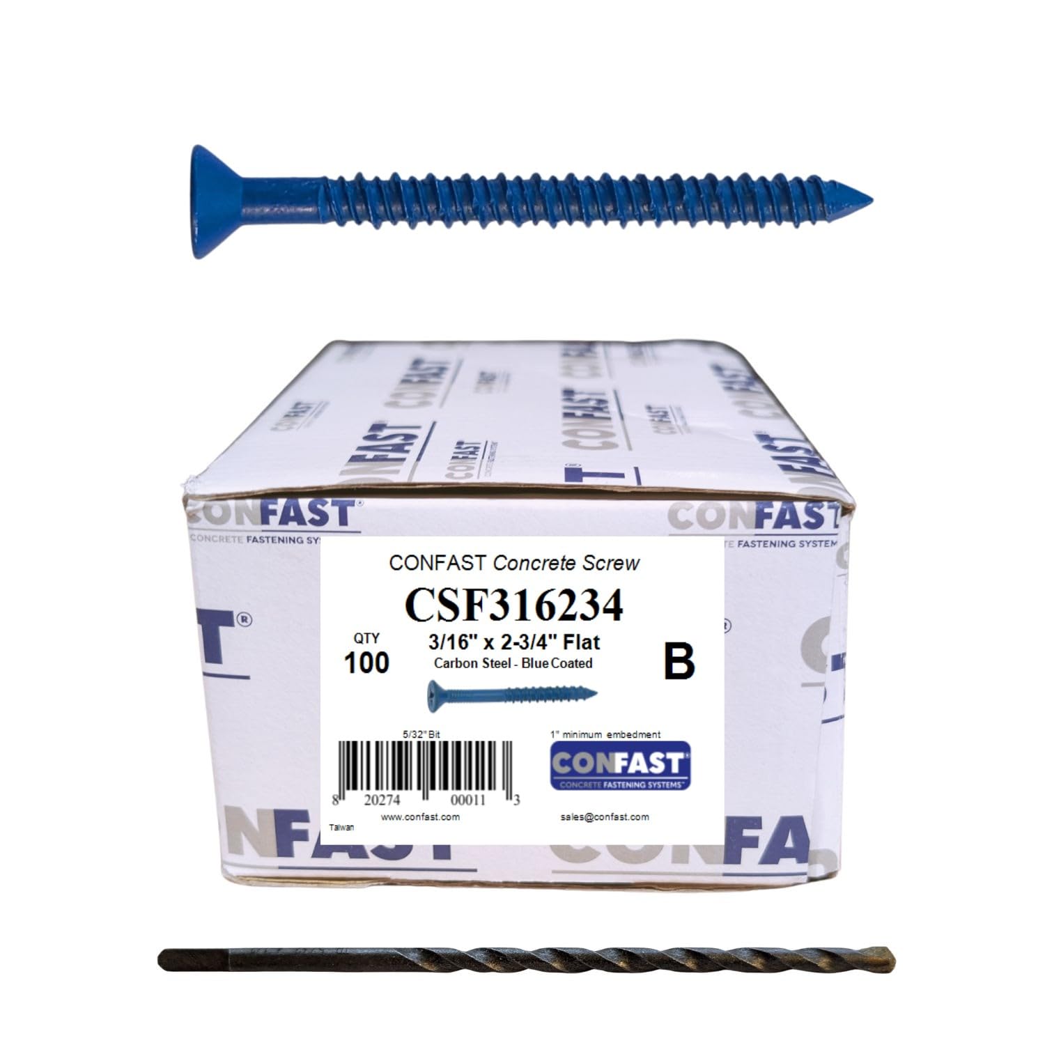 ApplicationsThe anchor is made from Carbon Steel, and is Blue. This anchor is designed for use in Concrete, Block, and Brick.EnvironmentThe anchor is designed for use in a Dry environment.Head Style The anchor is a Flat Countersunk Phillips head and is designed to prevent the head from protruding above the surface of the item being attached.Hole Diameter/Bit DiameterThe anchor requires a 5/32 hole to be drilled in the base material (Concrete, Block, and Brick). The hole should be drilled with carbide tipped bit that meets ANSI standards and used in a hammer drill.Driver RequiredA #2 is required for driving the anchor into the base material.Diameter of Anchor The diameter of the anchor is 3/16.Length Anchor The length of the anchor is 4Thread LengthThe length of the threads on the anchor is 1-3/4 in length.Minimum EmbedmentThe minimum anchor embedment into the concrete is 1. Therefore, the anchor must be installed so that a minimum of 1 of the anchor is embedded into the concrete.Maximum Fixture ThicknessThe maximum fixture thickness or the maximum thickness of the material being fastened for a anchor is 2-1/2 to 3. This will ensure that the minimum embedment of 1 will be met.Fixture Hole DiameterThe hole in the fixture or material being fastened must be larger than the designated diameter of the anchor. The 3/16 diameter anchor requires the hole in the fixture to be 1/4.Spacing between AnchorsEach anchor must be spaced a minimum distance of 3 from each other when measured center to center.Edge DistanceIt is very important not to install the anchor any closer than 2-1/4 from an unsupported edge of the concrete.
