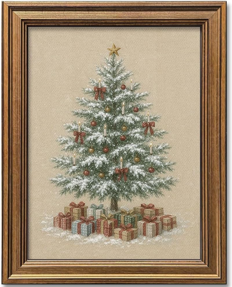 Transform your space with this enchanting vintage-style Christmas wall art that captures the timeless magic of the holiday season. The sepia-toned artwork depicts a heartwarming winter scene featuring a traditional figure carrying a freshly gathered Christmas tree through a snow-covered forest. The delicate monochromatic illustration showcases exquisite detail, from the fur-trimmed coat and wrapped belt to the carefully rendered evergreen trees in the misty background. Elegantly presented in a classic golden frame with subtle textural details, this piece adds a touch of nostalgic charm to any room. The artwork's warm sepia tones and traditional subject matter make it a versatile addition to holiday decor that pairs beautifully with both modern and traditional interior styles. Perfect for creating a cozy, festive atmosphere in living rooms, entryways, or any space that could use a dash of seasonal warmth. This framed print serves as both a decorative focal point and a cherished reminder of Christmas traditions past.