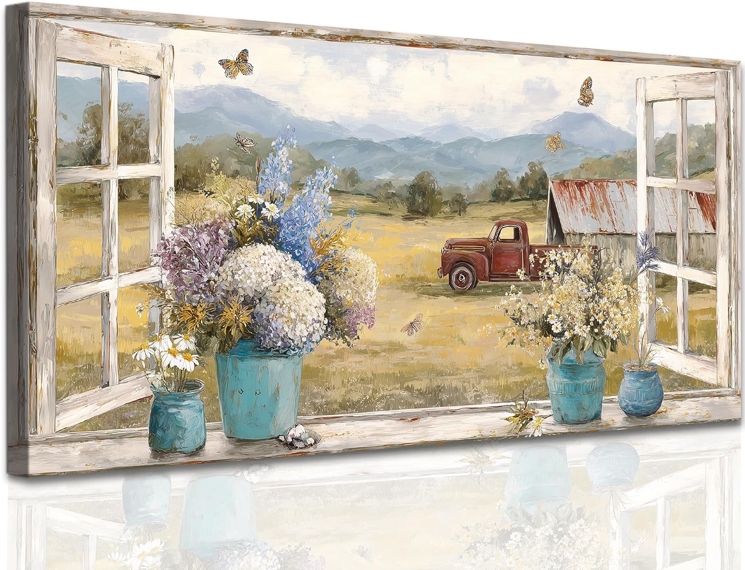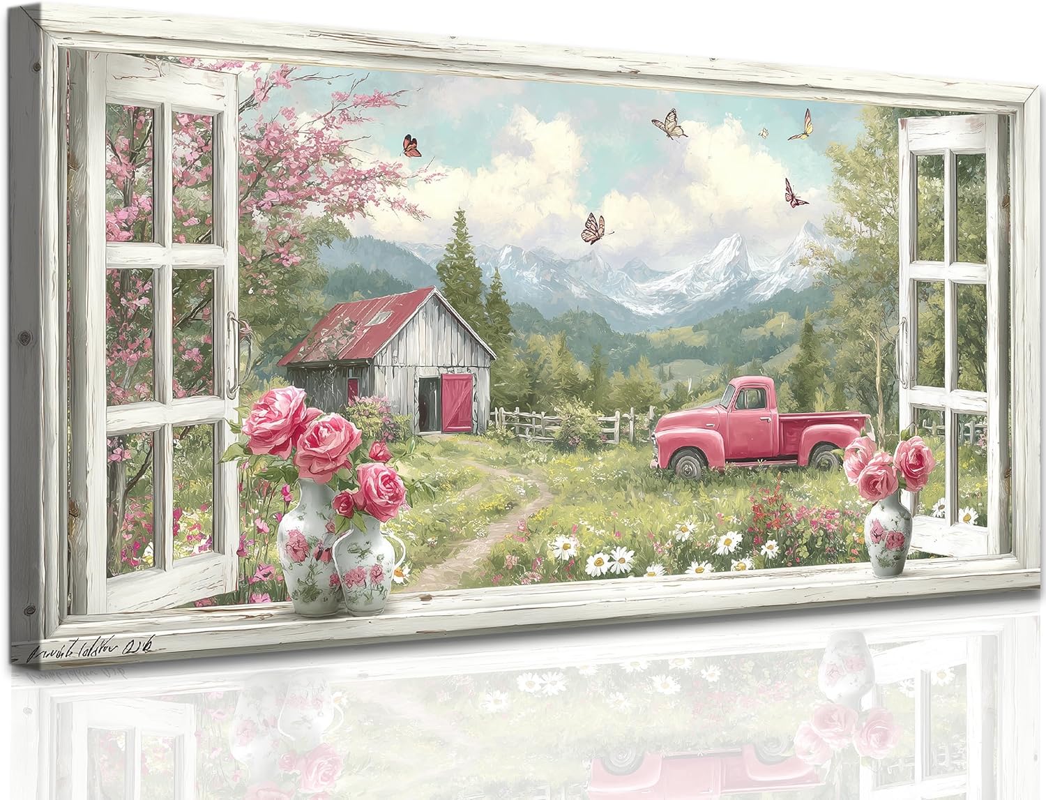 Timeless Floral Farmhouse Wall Art for Every HomeInfuse your living space with the fresh beauty and heartfelt charm of TIMUBA's floral canvas wall art. Designed for those who appreciate rustic farmhouse tradition, this piece merges the nostalgic appeal of barn decor and old truck artwork with contemporary, vibrant floral wall decor. Ideal for bedrooms, bathrooms, corridor décor, or as a centerpiece in living rooms and home offices, this artwork instantly elevates any interior.Premium Construction & Vivid DesignCrafted from premium canvas and framed in Nordic pine wood, each print features fade-resistant, eco-friendly inks that retain their brilliant color for years. The high-definition inkjet printing technique brings every flower and scenic detail to life, including the unique fake window layout that opens to tranquil coastal waters, distant farm landscapes, and whimsical pink blooms. Water-resistant and easy to clean, this piece is designed to withstand everyday environments while maintaining its stunning visuals.Effortless Installation & Farmhouse StorytellingArrives ready to hang, thanks to pre-installed hardware and the professionally stretched canvas over a sturdy frame, ensuring a hassle-free experience. From country-style homes to modern interiors, this artwork celebrates American agricultural legacy—connecting the viewer to memories of farm life, old trucks, and serene wildflower fields.Versatile Sizes & Thoughtful Gift ChoiceSelect from multiple size options to perfectly suit your wall. This large flower wall art makes a memorable gift for Christmas, weddings, or housewarmings, creating heartfelt connections and joy in any setting. Choose TIMUBA to add lasting value and aesthetic pleasure to your home.
