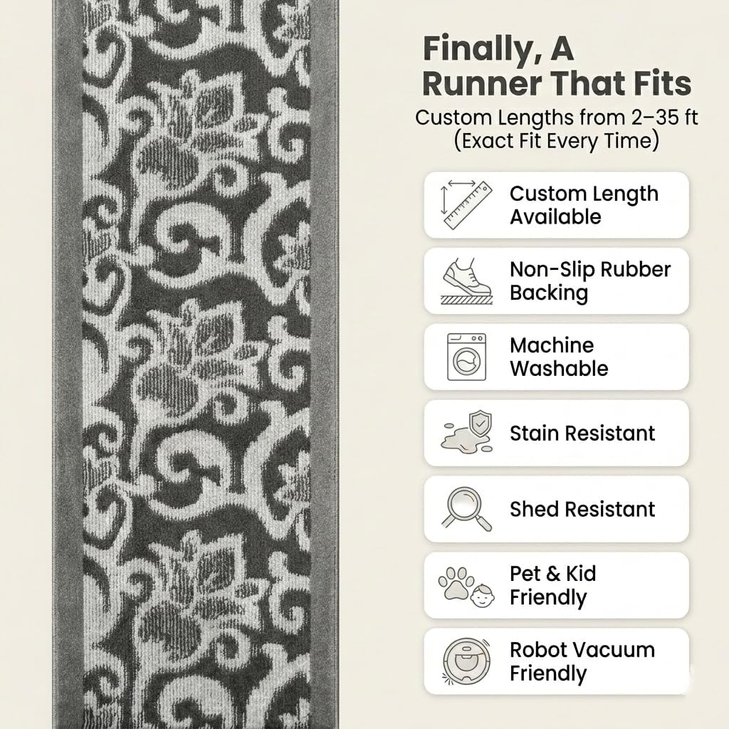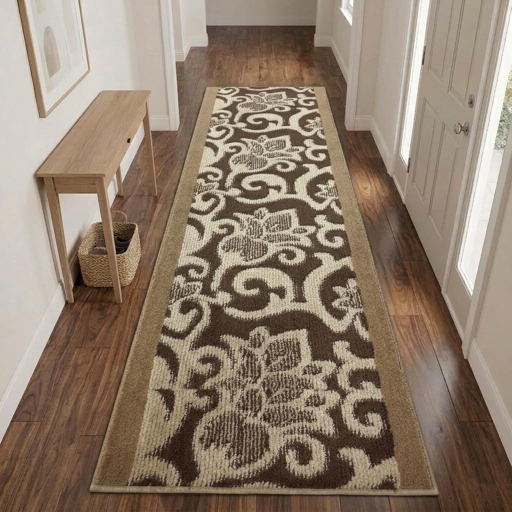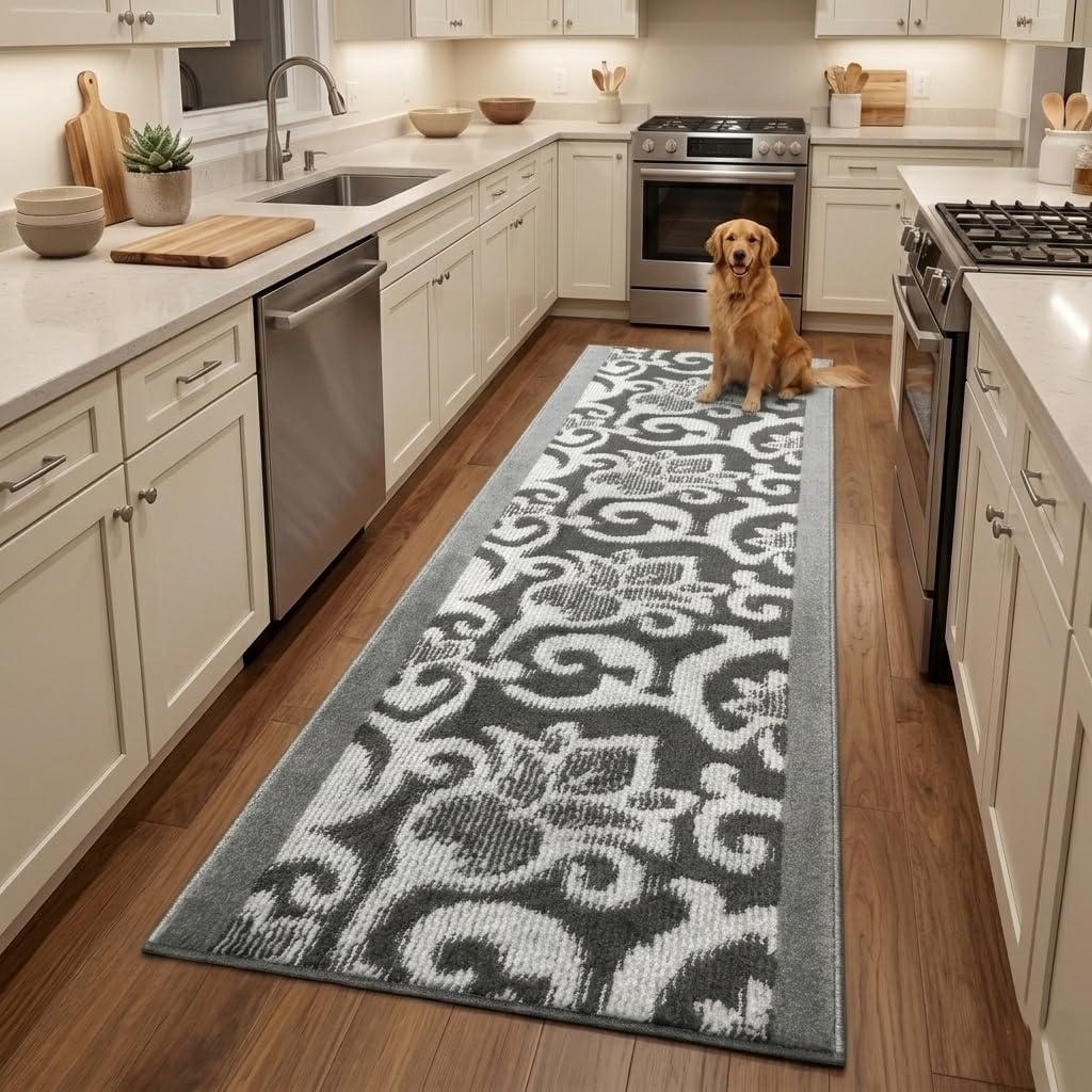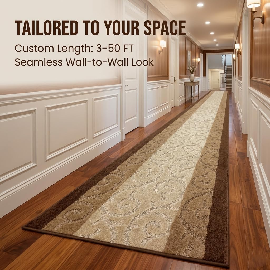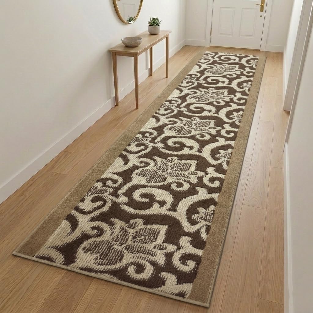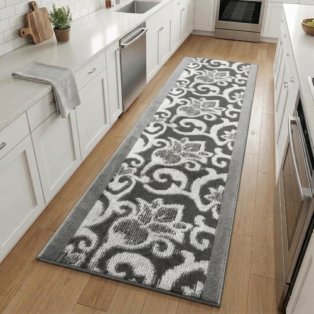 This non slip runner rug on our list is customizable | Before your purchase, measure the length and width of the space you want your runner rug to go. -Select the desired Runner Rug Pattern and Size from the variation menu provided. CHOOSE YOUR DESIGN and SPECIAL LENGTH | Customized Cut for Your Hallway, Entryway, Foyer or Kitchen | Narrow Width of 31-inch X Select Custom Length (± Half-Inch Manufacturing Tolerance). SLIP SKID RESISTANT RUBBER BACKING | No Adhesive, No Installation, Ready to Use | Non-Shedding | Inherently Stain Resistant | Smooth Texture | Long-Lasting Soft Touch Polypropylene Fibers | Machine Made | Power-Loomed | Medium Profile Pile 0.35 Inch | Performs Best When in Contact Directly with Hard Surfaced Bare Floors. Perfect for hardwood floors and for high traffic areas | Use of Carpet Tapes Will Cause Permanent Damage Even Peeling Away the Rubber Backing. DIY FAST EASY HALLWAY KITCHEN DECOR | Protect and Preserve Your Hardwood Floors | Increase Friction to Prevent Slipping and Falling Accidents | Effective Sound Reduction | Stronger Traction and Stability for Your Family and Pets | Pet Friendly Senior Elder Ageing Dog Traction Assist | Stop Pet's Claws from Scratching the Hard Surfaced Floors. INDOOR RESIDENTIAL USE | Not Suitable for Commercial Use and Carpet Over Carpet Applications ( Carpet Over Carpet Applications Will Cause Buckling and Bunching Up Your Runner Rug) EASY CARE | Machine Washable | Cold-Water Delicate Cycle | Dryers cause the runner rug to become clingy | LAY FLAT OR HANG TO AIR DRY ONLY. SHIPPING | Rolled Up and Well Packaged to Minimize Wrinkles and Creases. We do not fold our runner rugs when we ship them to you.