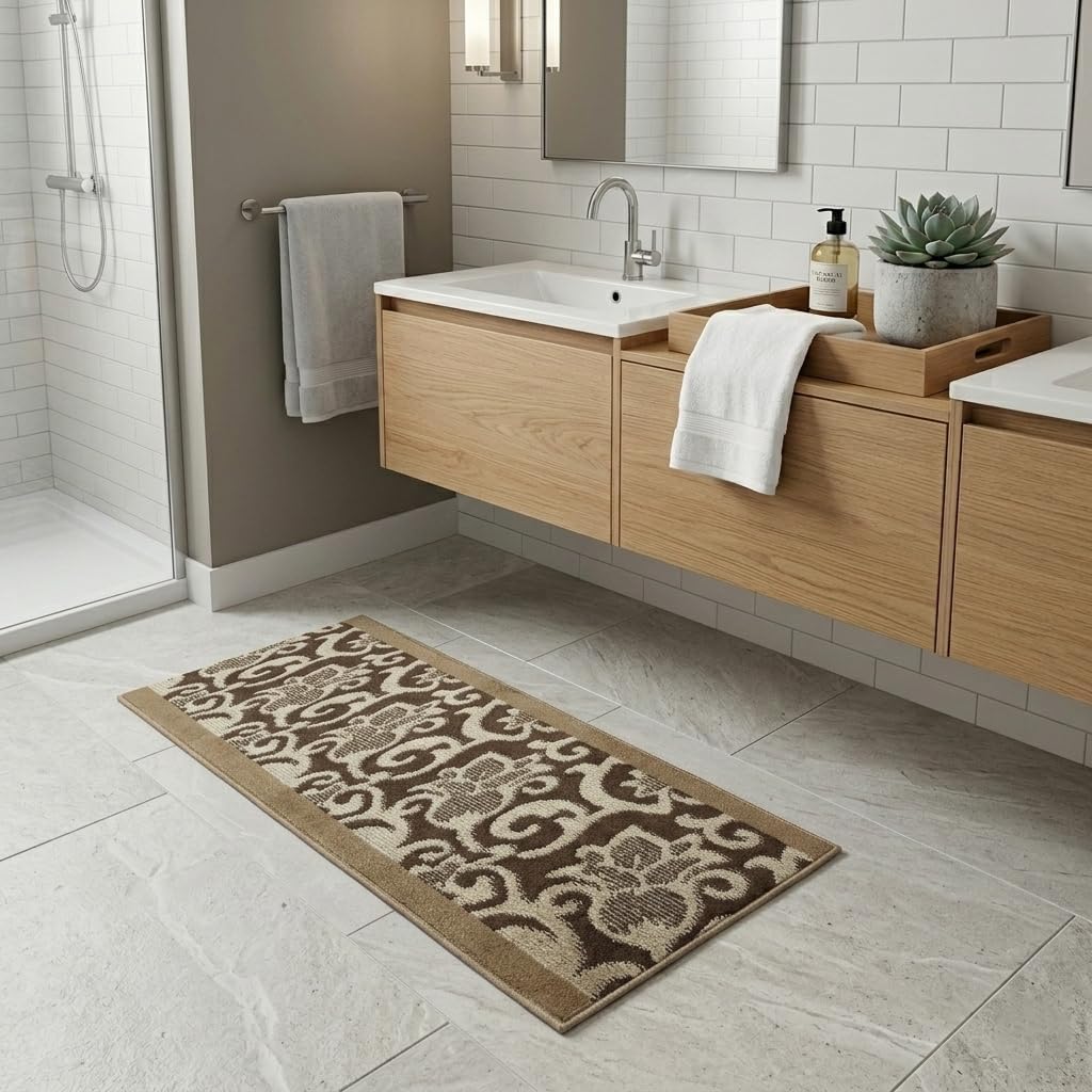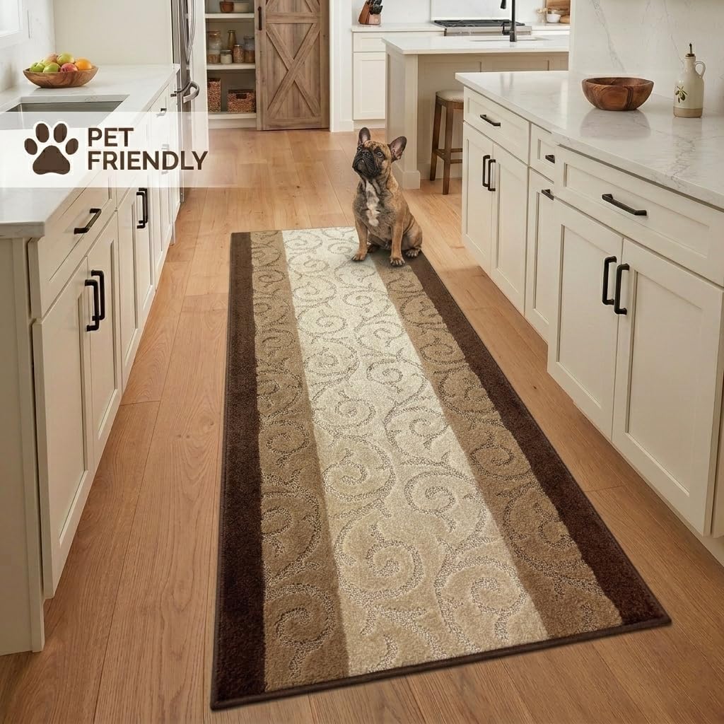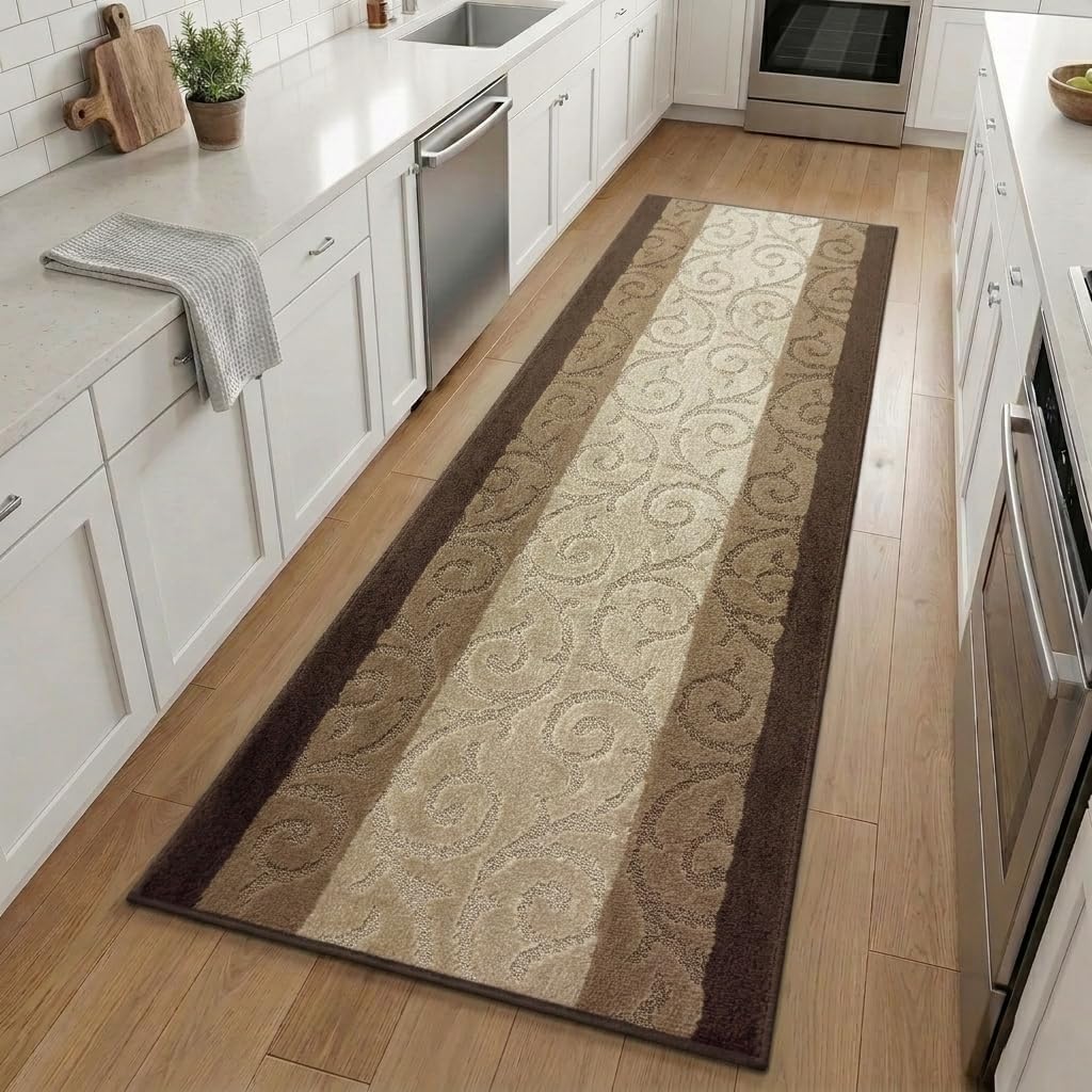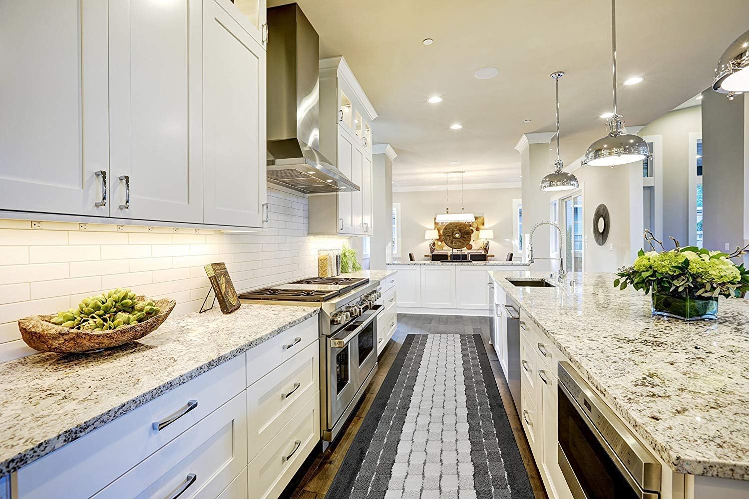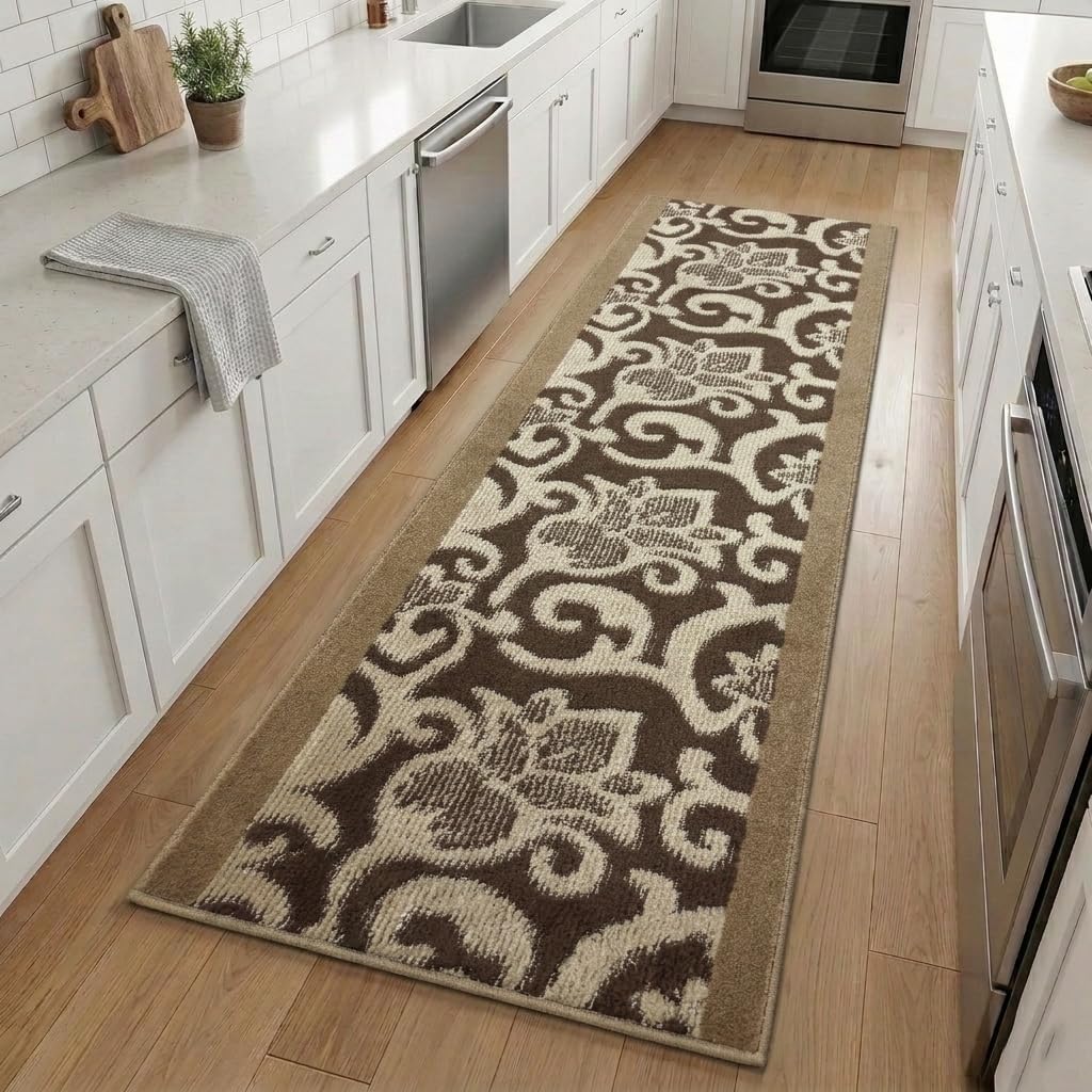 This non slip runner rug on our list is customizable | Before your purchase, measure the length and width of the space you want your runner rug to go. -Select the desired Runner Rug Pattern and Size from the variation menu provided. CHOOSE YOUR DESIGN and SPECIAL LENGTH | Customized Cut for Your Hallway, Entryway, Foyer or Kitchen | Narrow Width of 31-inch X Select Custom Length (± Half-Inch Manufacturing Tolerance). SLIP SKID RESISTANT RUBBER BACKING | No Adhesive, No Installation, Ready to Use | Non-Shedding | Inherently Stain Resistant | Smooth Texture | Long-Lasting Soft Touch Polypropylene Fibers | Machine Made | Power-Loomed | Medium Profile Pile 0.35 Inch | Performs Best When in Contact Directly with Hard Surfaced Bare Floors. Perfect for hardwood floors and for high traffic areas | Use of Carpet Tapes Will Cause Permanent Damage Even Peeling Away the Rubber Backing. DIY FAST EASY HALLWAY KITCHEN DECOR | Protect and Preserve Your Hardwood Floors | Increase Friction to Prevent Slipping and Falling Accidents | Effective Sound Reduction | Stronger Traction and Stability for Your Family and Pets | Pet Friendly Senior Elder Ageing Dog Traction Assist | Stop Pet's Claws from Scratching the Hard Surfaced Floors. INDOOR RESIDENTIAL USE | Not Suitable for Commercial Use and Carpet Over Carpet Applications ( Carpet Over Carpet Applications Will Cause Buckling and Bunching Up Your Runner Rug) EASY CARE | Machine Washable | Cold-Water Delicate Cycle | Dryers cause the runner rug to become clingy | LAY FLAT OR HANG TO AIR DRY ONLY. SHIPPING | Rolled Up and Well Packaged to Minimize Wrinkles and Creases. We do not fold our runner rugs when we ship them to you.