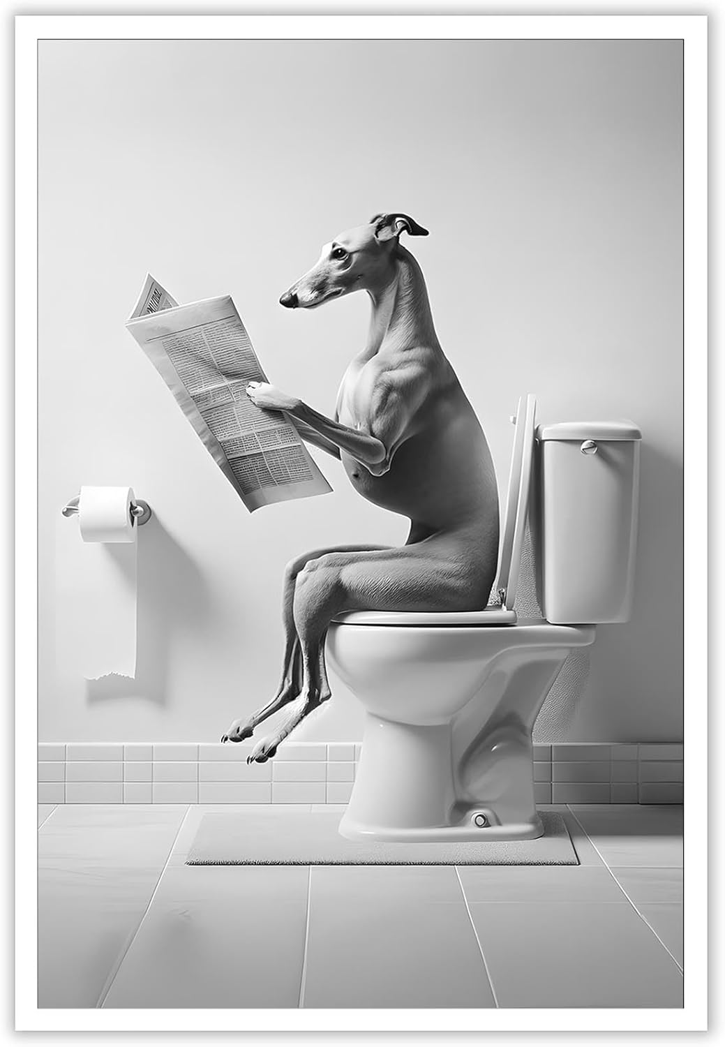 Add a dose of whimsy to your décor with our Funny and Cute Greyhound Posters. Each one featuring an adorably unexpected scene of a greyhound enjoying some private time on the toilet, these prints are a wonderful conversation starter and will surely bring a smile to any visitor's face. These posters are perfect for all rooms - be it the bathroom, bedroom, living room or office, it lends a unique charm that's hard to miss. With high-quality printing and vibrant colors, the visual appeal of these posters is undeniable. You can use them as a refreshing change to the usual wall art or incorporate them into your sofa room decor. Celebrate your love for dogs and make a statement with these fantastic greyhound prints. These posters make a great gift for pet lovers and those who appreciate quirky and cute aesthetics. Lighten up your home or workplace with this delightful piece of art today!