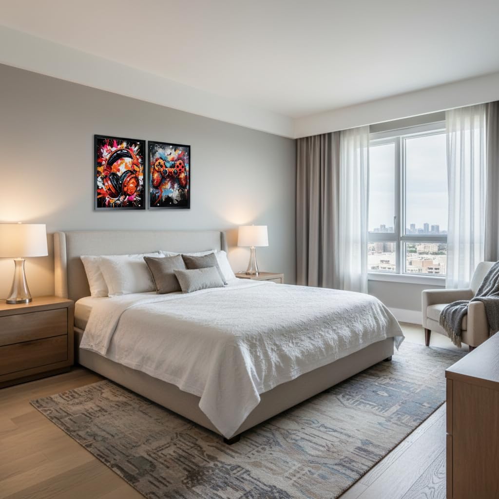 Upgrade your gaming space with this Gaming Framed Wall Art Set of 2. Featuring dynamic and colorful designs of a game controller and gaming headset, these artworks add a bold and modern gamer vibe to any room. Each piece comes mounted in a solid wooden frame and includes hooks and traceless nails, allowing for quick and hassle-free installation. With a size of 16 x 12 inches per panel, this coordinated diptych is perfect for bedrooms, game rooms, living rooms, or streaming setups. Printed on premium canvas using fade-resistant inks, these framed gaming wall art prints maintain vivid colors and crisp details over time. Whether decorating your own gaming room or gifting to a gamer friend, this set delivers style, energy, and personality.