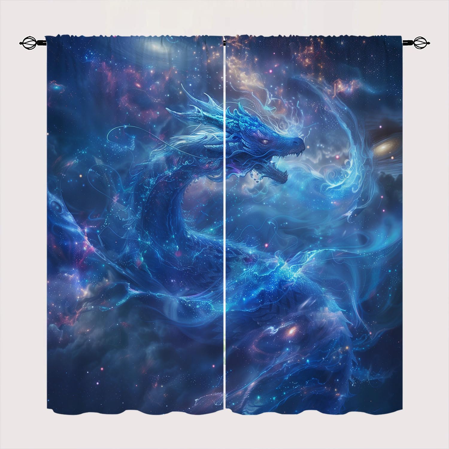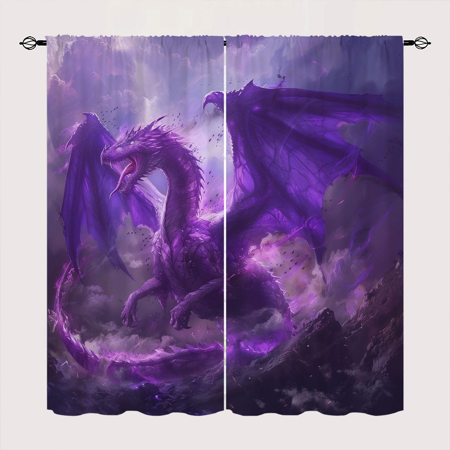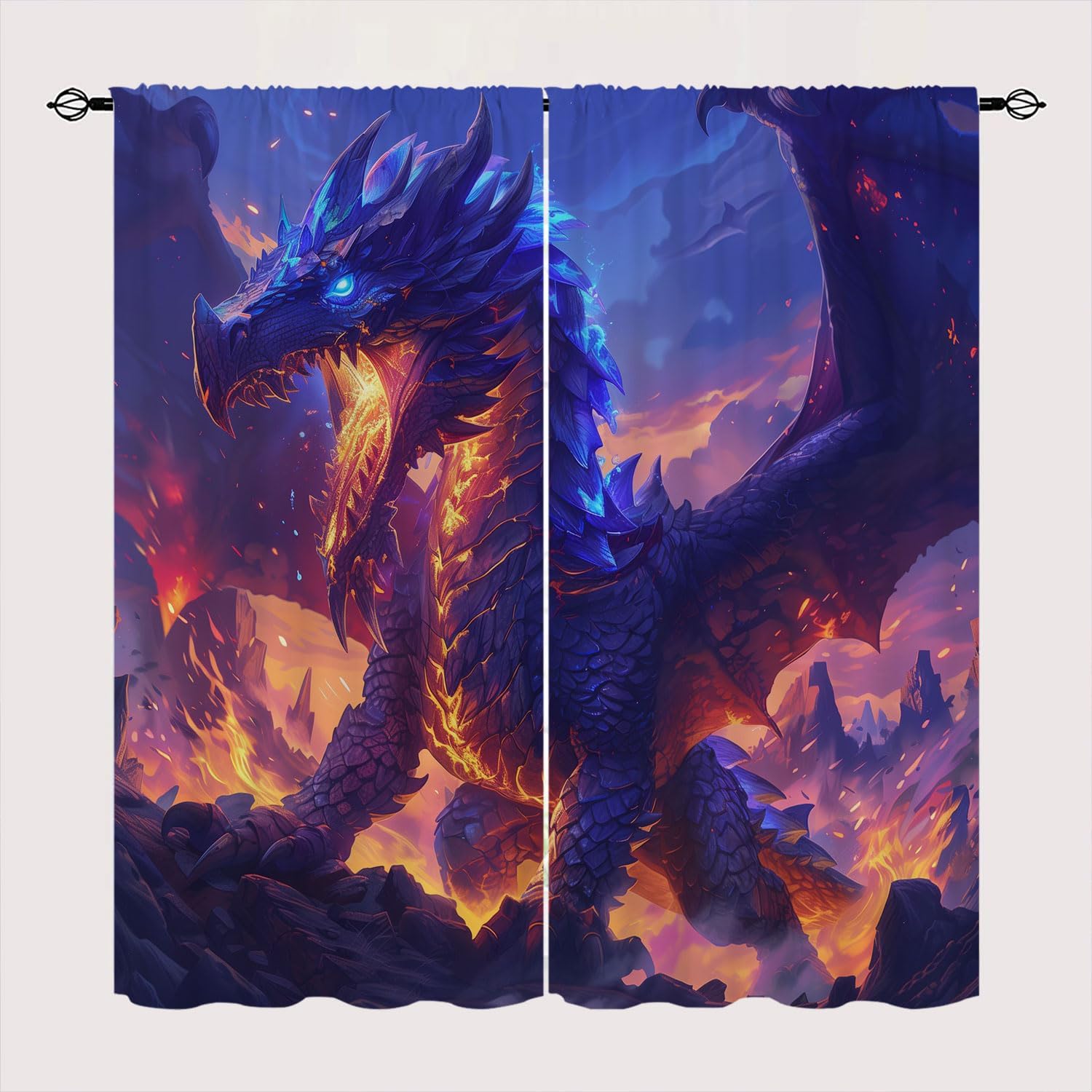 Dragon Wolf Blackout Curtains Custom Design Shop:Our curtains Immerse your home in splashes of color.The 3d print curtains give off a realistic tint in the whole room and turns the room into a magical colorful fairy-scape.Premium Material:Adopt high-quality 100% polyester fabric.Three-layer woven fabric, high-precision black silk shading partition, density of the middle black silk layer is double that of ordinary fabrics, greatly improve the shading effect.HD Printing Technology:High resolution pictures bring a perfect visual experience to your life.Industry-leading HD printing technology, No strange odor. Toxic free and safe.Multiple Functions:Our bedroom curtains can block 98% of sunlight and UV rays from entering the room.These soft and durable curtains are made by innovative technology durable, high performance on room darkening, thermal insulated, noise reducing, energy saving / efficiency and privacy protection.Avoid glare. Protects furniture from exposed to direct sunlight from fading over time.Easy Cleaning:This blackout curtains machine washable, gently cycle, no bleach, tumble dry low, and iron at low temperature settings.Warm Tips:-Please kindly allow 0.39"-1.18" (1-3cm) deviations due to manual measurement.-Color difference is allowed due to light effects.-White on the other side that faces out the window.-Support to customize the same style of rod pocket curtain. If you need, please email us.