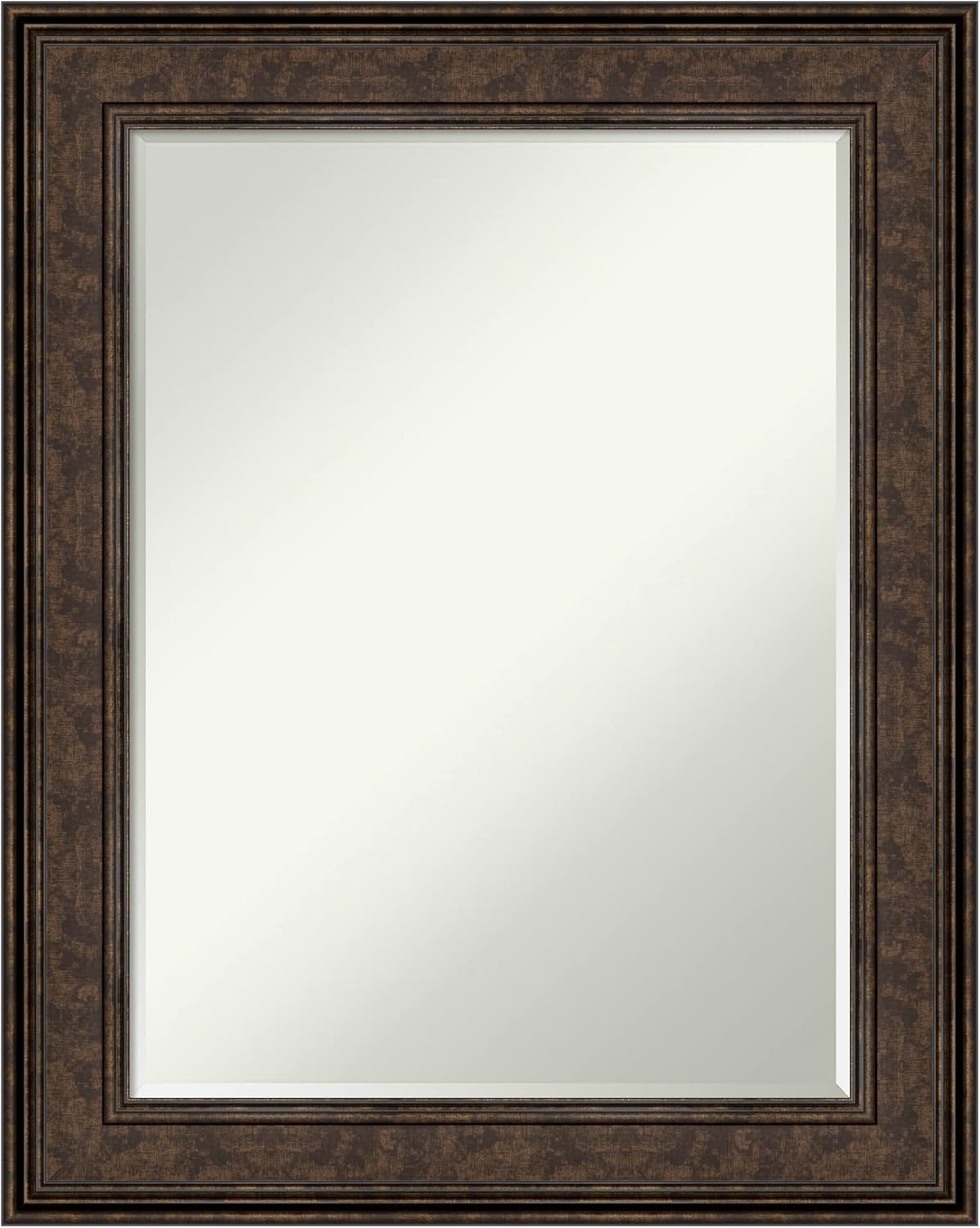 PRODUCT: Amanti Art Petite Bevel Wall Mirror; OUTER SIZE: Exactly 21.5 x 27.5 inches; FRAME: Accent Bronze Narrow; FRAME FINISH: Antique Bronze; FRAME COLOR: Bronze. The Accent Bronze Narrow frame is a contemporary, burnished bronze frame with a lifted outer ridge and face that scoops down to meet an inner dark golden beaded edge. Give your home or office the finishing touch with this framed wall mirror. Individually made using traditional custom framing techniques, it has the quality you would expect from your local frame shop. It holds its value with premium finishing that can be appreciated up close. Because of our attention to detail and focus on artistry, architects, interior designers, and homeowners alike choose this mirror to create beautiful living spaces.
