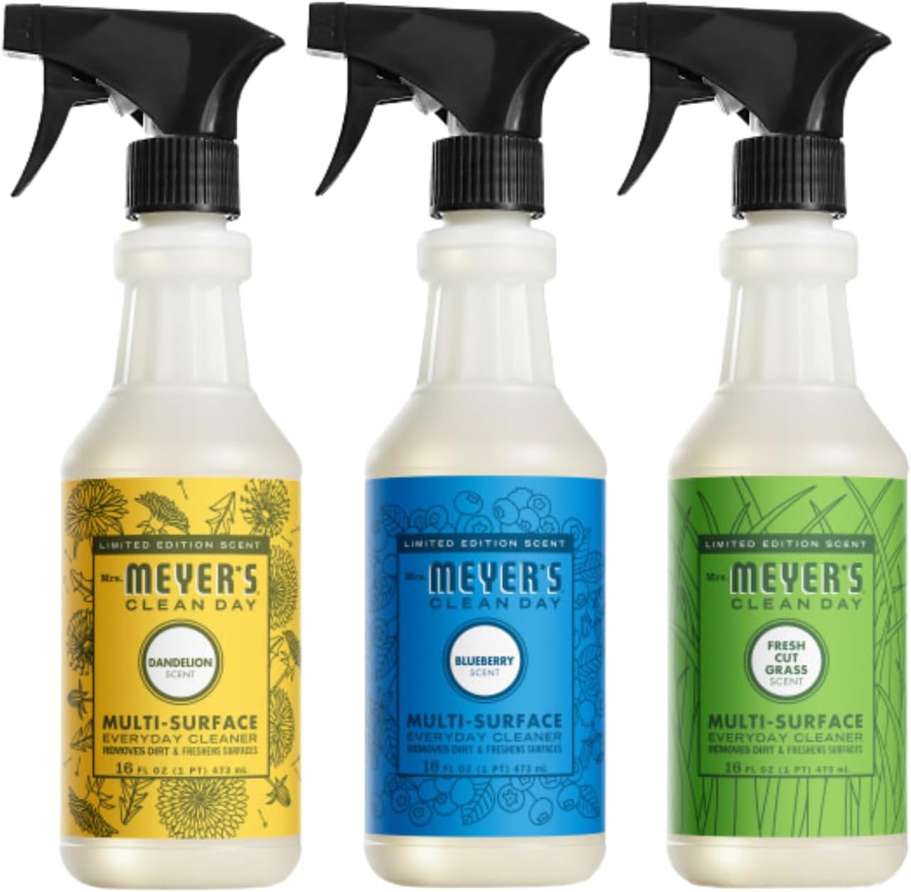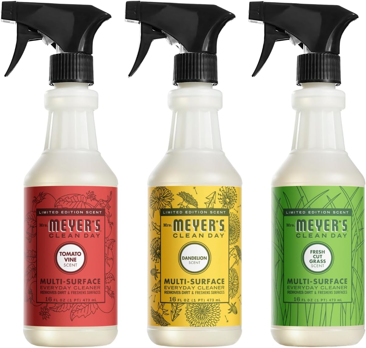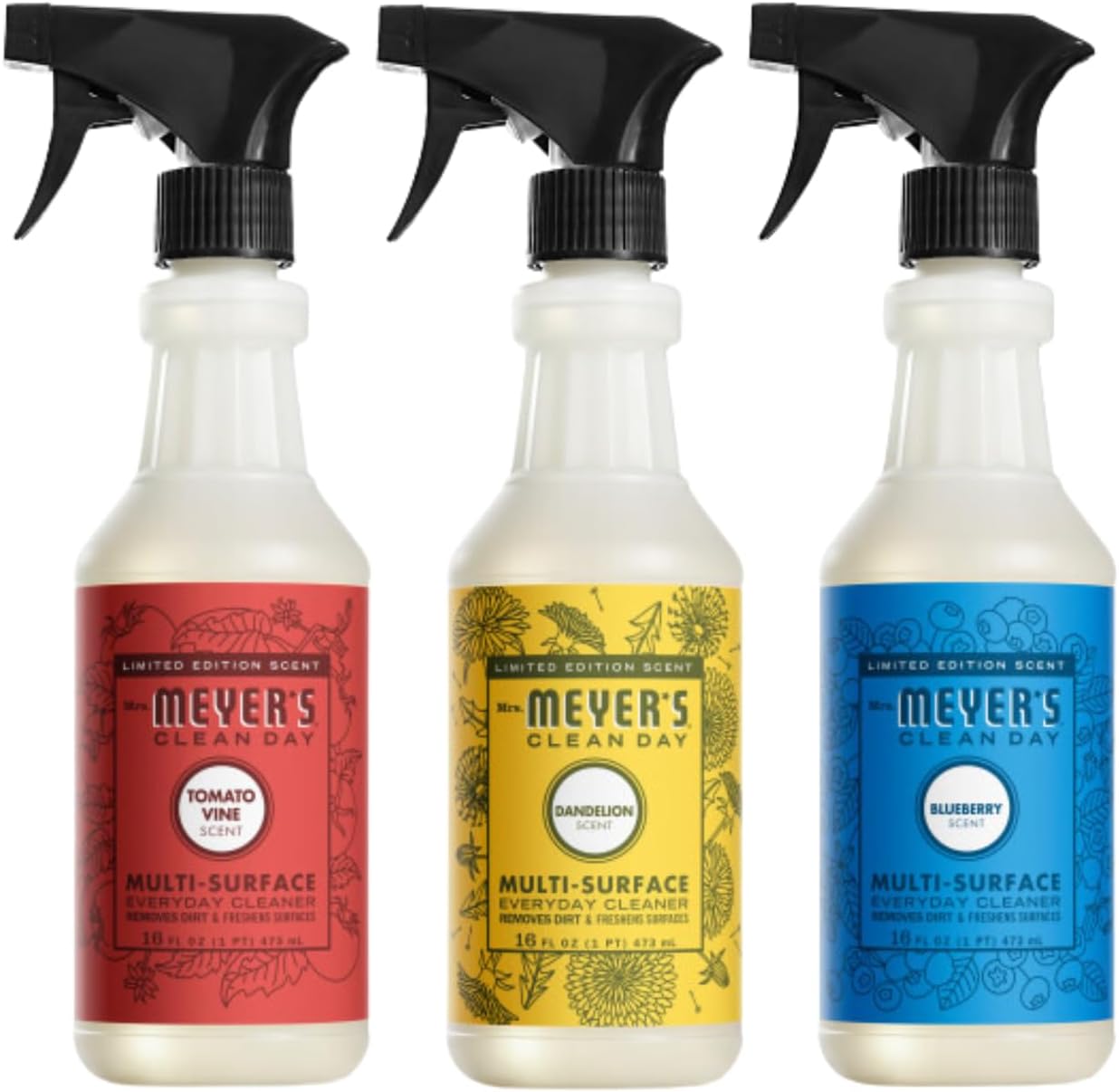Mrs. Meyer’s Clean Day Multi-Surface Everyday Cleaners combine hardworking, yet gentle, cleaning agents with delightful garden-inspired scents, providing a fresh and clean home with every use. Each cleaner is infused with essential oils and carefully selected natural ingredients to offer a powerful, solution for everyday messes. Perfect for non-porous surfaces, our all-purpose spray is ideal for kitchen counters, finished wood and tile floors, porcelain, bathroom fixtures, walls, sealed natural and synthetic stone, and more. Available in a range of delightful scents, including the special Tomato Vine, which delivers a subtly sweet, earthy fragrance with a bright, herbaceous burst. Another favorite, Dandelion, captures the whimsy of honeyed sweetness and fresh floral notes, creating a feeling of joy and warmth. For those sunny summer mornings, Blueberry offers a refreshing blend of ripe sweetness with a crisp tart edge, evoking nostalgia and simplicity. Mrs. Meyer’s Clean Day isn’t just about cleaning—it’s about bringing a touch of garden goodness into your home. Whether you’re tackling tough kitchen messes or refreshing other surfaces, our eco-friendly cleaning sprays, along with our dish soaps and laundry detergents, are gentle yet effective, helping you maintain a clean, fresh, and fragrant home with every use. Mrs. Meyer’s—rooted in goodness.