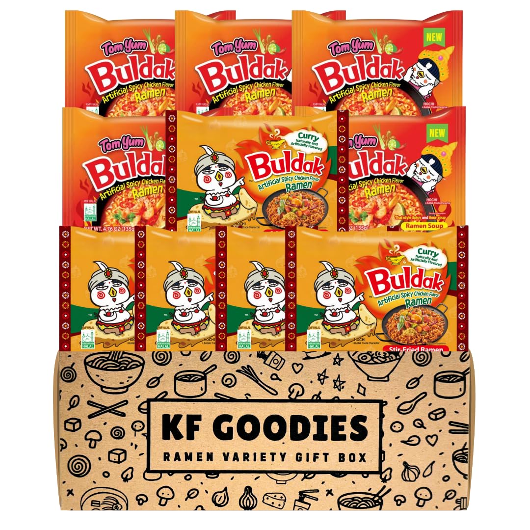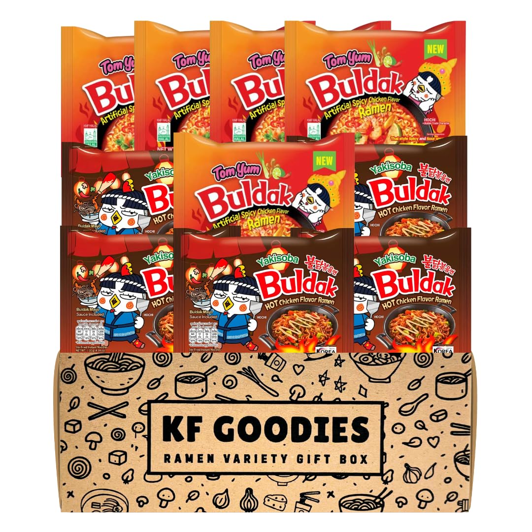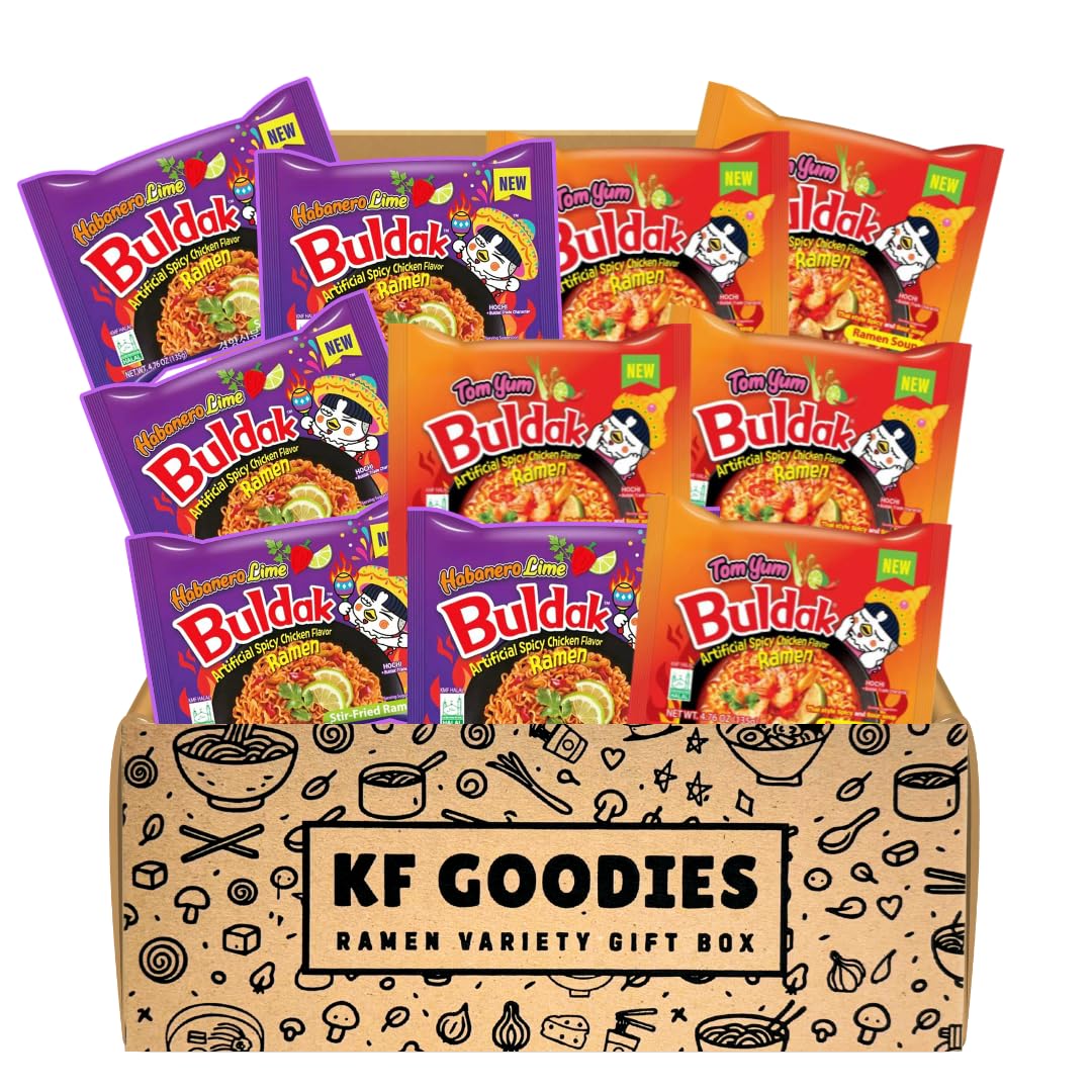 Experience an explosion of bold flavors with the KF GOODIES Korean Ramen Variety Pack Gift Box. This curated set includes authentic Korean Buldak spicy noodle flavors, carefully selected and packaged by KF GOODIES in an exclusive gift box. This special set contains 2X, Carbonara, Cheese, Cream Carbonara, Habanero Lime, Original, Quattro Cheese, Rosé, Swicy, Taco, Tom Yum & Yakisoba. Each pack is individually sealed making this assortment the perfect choice for ramen lovers, care packages, or unique gifts.