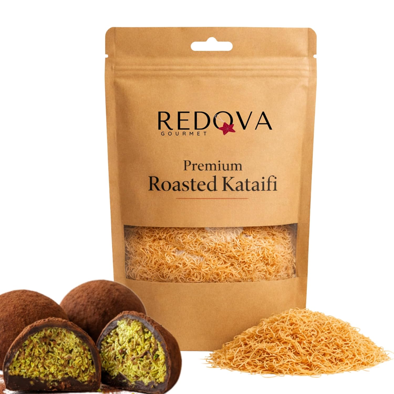 Product Description (US) Redova Premium Roasted Kataifi is designed for home bakers and dessert lovers who want maximum crispness and convenience without extra preparation. This 200g (7 oz) pack offers the perfect size for trying new recipes, creating viral desserts, or preparing small batches with professional-quality results. Our kataifi is pre-roasted (muhallebilik) to a beautiful golden color, making it ready to use straight from the package. There is no need for additional roasting or drying, saving time while delivering consistent texture. The finely shredded strands are short-cut and evenly sized, approximately 1–3 cm in length, which helps the kataifi crisp evenly and layer smoothly in desserts. This texture makes it especially suitable for Dubai chocolate bars, pistachio-filled desserts, muhallebi toppings, kunafa, knafeh, and modern chocolate-based creations. Whether used as a filling, topping, or crunchy layer, Redova kataifi provides a clean snap and reliable structure that elevates both traditional and contemporary desserts. Produced in Turkey using time-honored techniques, Redova kataifi is made with only wheat flour and water. It contains no preservatives, additives, or artificial ingredients, making it a vegan-friendly, clean-label choice you can trust. Each pack is sealed to maintain freshness and crispness during storage. The 200g size is ideal for home kitchens, dessert kits, gifting, and first-time use. Easy to store and shelf-stable, it allows you to experiment confidently while achieving the same crisp, professional finish every time.