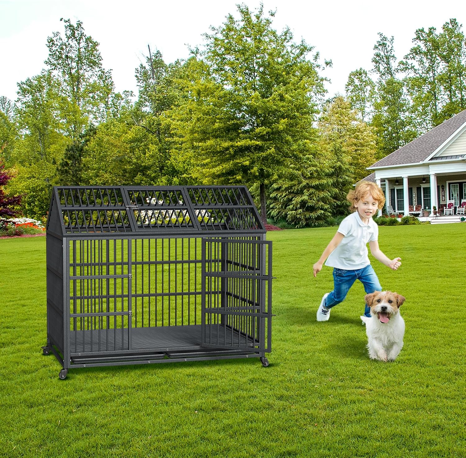 Ensure your dog's comfort and safety with our sturdy iron dog cage, featuring a convenient dual door design, easy-clean tray, making it perfect for pets of all sizes!Highlights at a Glance:Sturdy iron construction for lasting durability and security.Convenient dual doors for easy access and interaction.Folding design with 360° rolling casters for portability.Easy clean tray for hassle-free maintenance.Roof-shaped top provides extra comfort for your pet.Specification:Material: MetalSuitable: Small to Large Size DogsPacking List:1xDog Crate1xInstruction Manual1xAssembly KitNote:Ensure that the size of the dog cage is suitable for your dog. Dogs should be able to stand, turn, and lie down freely, but should not be too spacious to prevent them from defecating freely in the cage.Give the dog time to adapt to the cage, and gradually guide the dog into the cage in the early stages, using rewards and positive reinforcement to make it feel comfortable.