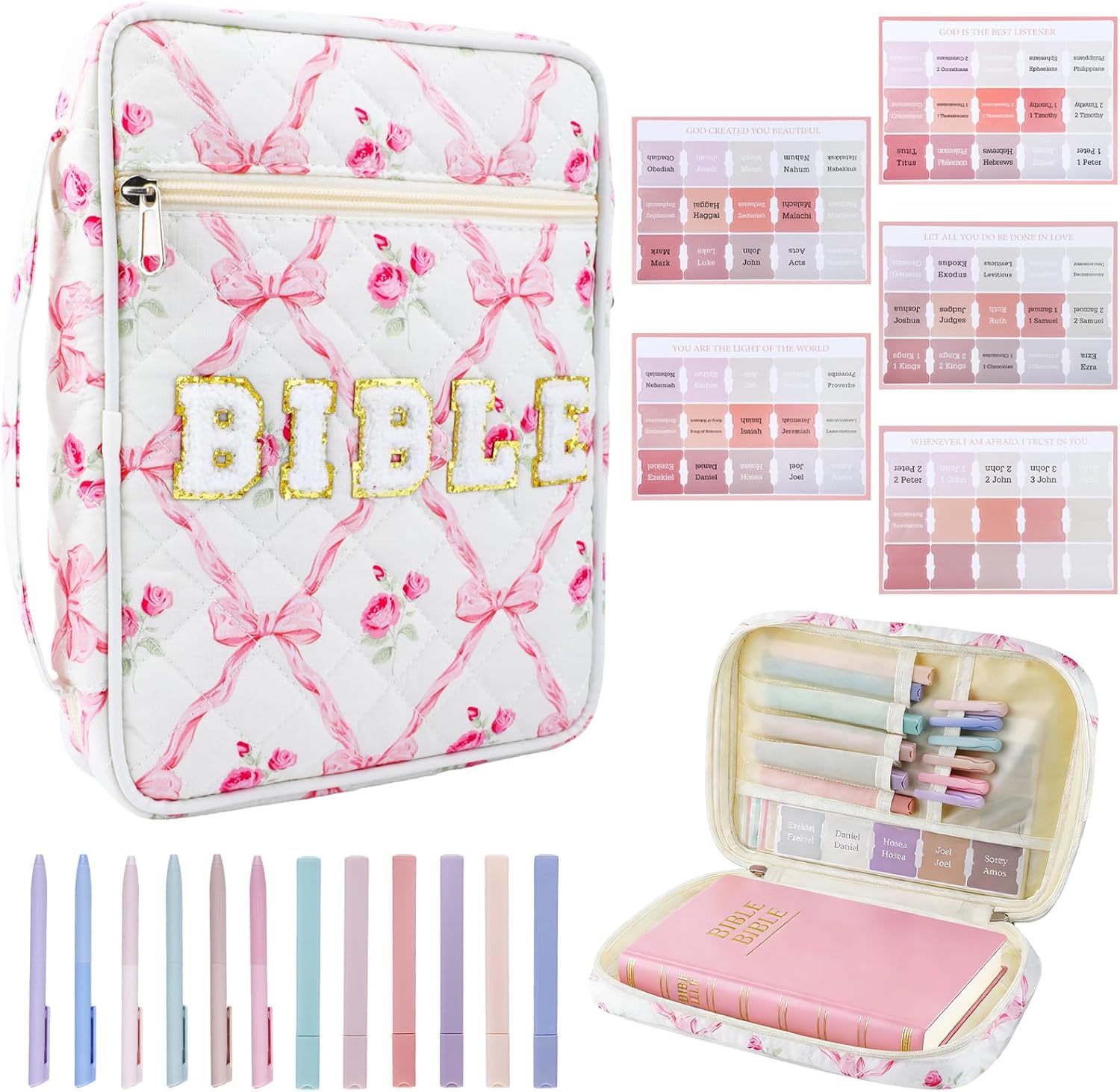 Large Bible Cover Case for Women, 12 x 9 x 2.5 Inch Letter Bible Bag with Shoulder Strap Carrying Bag with Tabs 6 Colored Pens 12 Highlighters, Study Supplies Christian Church Gifts, Wildflower