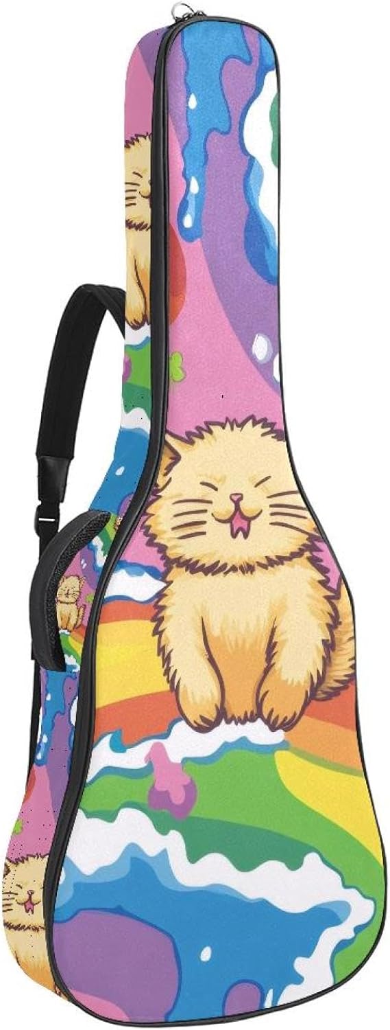 Give your valuable guitar the premium protection it deserves. Our Cute Printed Guitar Gig Bag is engineered for the modern musician who demands both security and convenience. Whether you're heading to a gig, a practice session, or on a short trip, this bag ensures your instrument arrives in perfect condition, ready to play.Constructed from durable, waterproof Oxford cloth, this bag stands up to the elements and the test of time. The interior is a sanctuary for your guitar, featuring ultra-thick padded sidewalls and a soft, anti-scratch lining that cradles your instrument, preventing scratches and damage. The heavy-duty rubber base acts as a shield against everyday bumps and allows for stable placement on any surface.Organization is effortless with multiple dedicated compartments. Two main storage pockets keep all your essential accessories—like a foldable music stand, tuner, picks, cables, and extra strings—neatly sorted and easily accessible. Never fumble for your tablet or sheet music again; the specially designed back pocket keeps them safe and separate.For a perfect, secure fit, the adjustable neck support and internal Velcro strap ensure your guitar does not shift around inside the bag, providing peace of mind with every carry.Care Instructions: To preserve the quality and appearance of your gig bag, please do not machine wash. Simply wipe clean with a damp cloth to remove any dirt or stains.