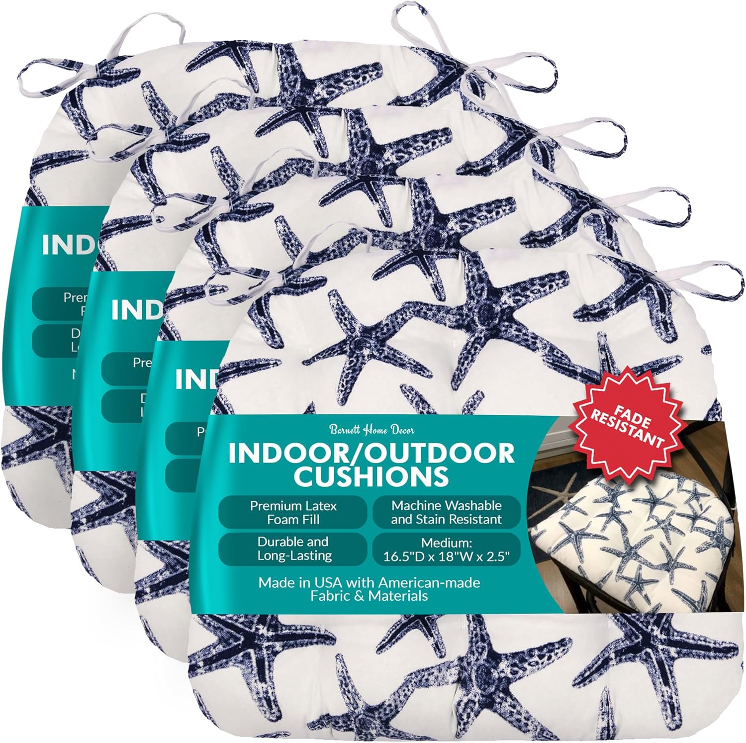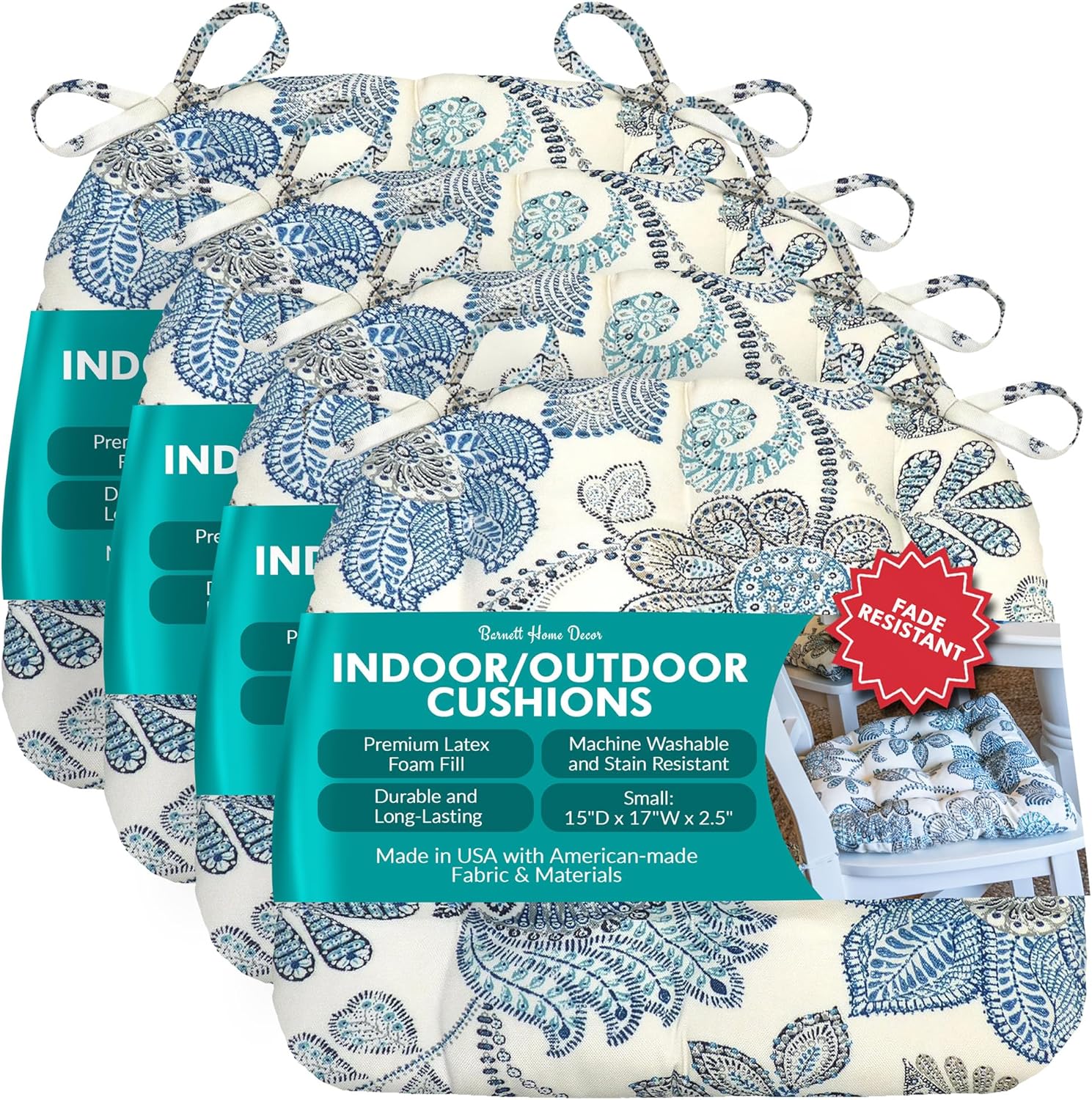 Introducing a premium range of versatile and durable chair cushions from Barnett Home Decor, specially designed to elevate your comfort in both indoor and outdoor settings. These outdoor chair cushions are meticulously crafted to old-fashioned standards of quality, ensuring long-lasting durability and style. With their fade-resistant and weather-resistant properties, our patio chair cushions are ideal for enhancing your outdoor spaces, from patios to gardens. Our cushions are engineered with a premium latex foam fill, providing superior comfort that resists flattening over time. Experience the luxury of sitting on cushions that maintain their plushness, whether you're using them as outdoor dining chair cushions or as kitchen chair pads. The durable lock-stitched seams and triple-stitched ties secure the cushions in place, and last longer than cushions made with flimsier construction methods, even in the busiest of family settings. These outdoor cushions are crafted from a second-generation performance indoor outdoor fabric that is tough enough to withstand the elements, yet soft enough for indoor use. This versatility makes them perfect as wicker chair cushions, dining chair cushions, or patio cushions. Our chair cushion with ties design ensures that they remain securely fastened, whether placed on a patio chair or an Adirondack chair. Cleaning is a breeze with these seat cushion outdoor chair pads. Simply toss them in the washing machine or use a garden hose for easy maintenance, and enjoy their stain-resistant features that keep them looking fresh and vibrant. With a commitment to quality, our chair pads for outdoor furniture are designed to withstand the test of time, providing you with a reliable and stylish seating solution. Choose our chair cushions for an unparalleled blend of comfort, durability, and style. Perfect for any setting, they are an investment in quality that promises to make your seating more comfortable, both inside and out.