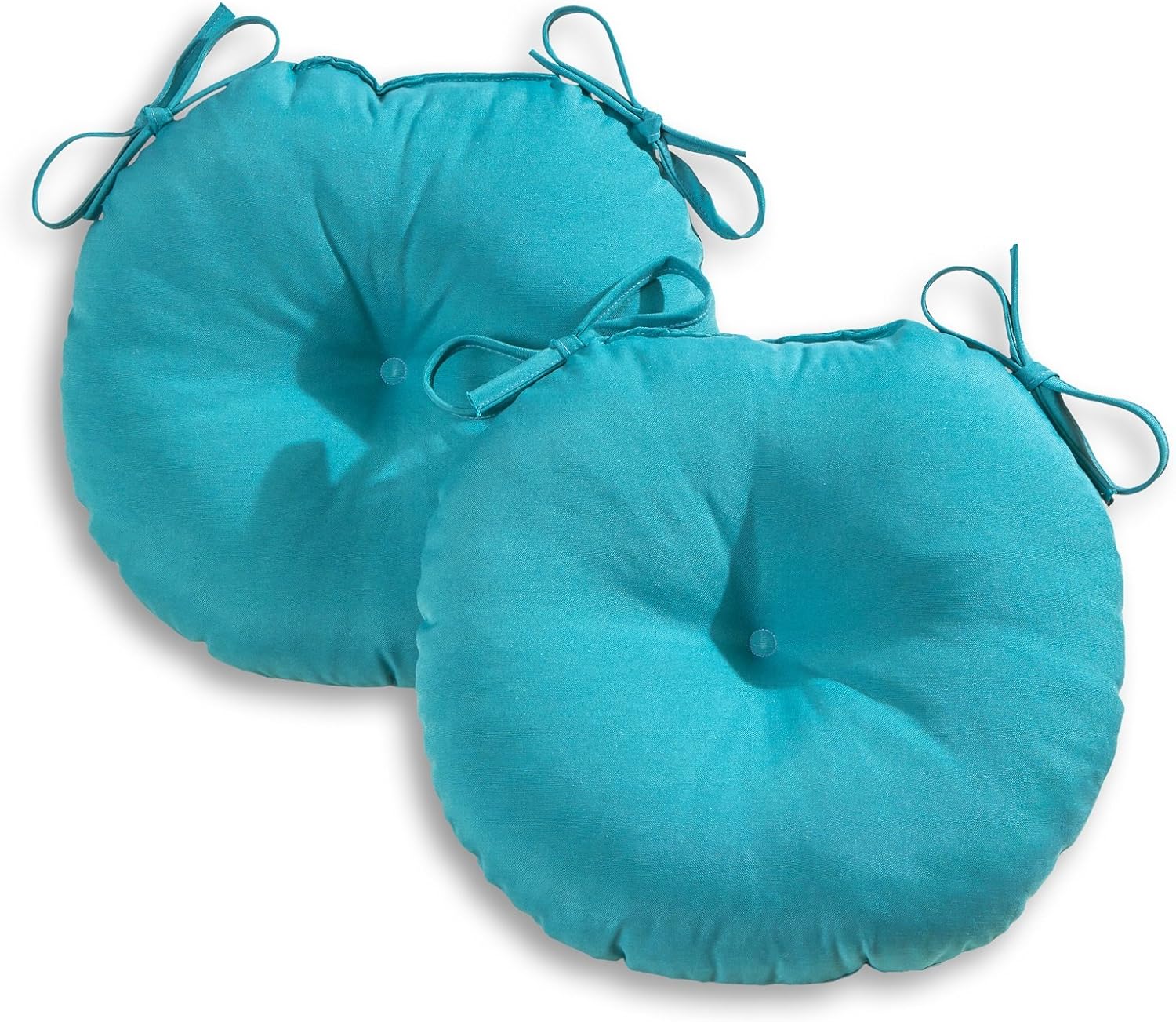 Add a bit of comfort and style to your outdoor bistro set with these Bistro Cushions from Greendale Home Fashions. Cushions feature a center circle tack which prevents filling from bunching and shifting, and two string ties to keep cushions firmly secured to chairs. Each set includes two 18 inch round chair cushions made from a 100% polyester, UV coated material that is fade, stain and water resistant. The cushion's soft poly fiber fill is made from 100% recycled, post-consumer plastic bottles, and overstuffed for added comfort, strength and durability. A variety of colors and prints are available to enhance your outdoor decor.Please Note: Cushion dimensions are +/- 2 inches. Product will arrive in a slightly compressed state; please allow a few days for product to expand to final size listed in description.