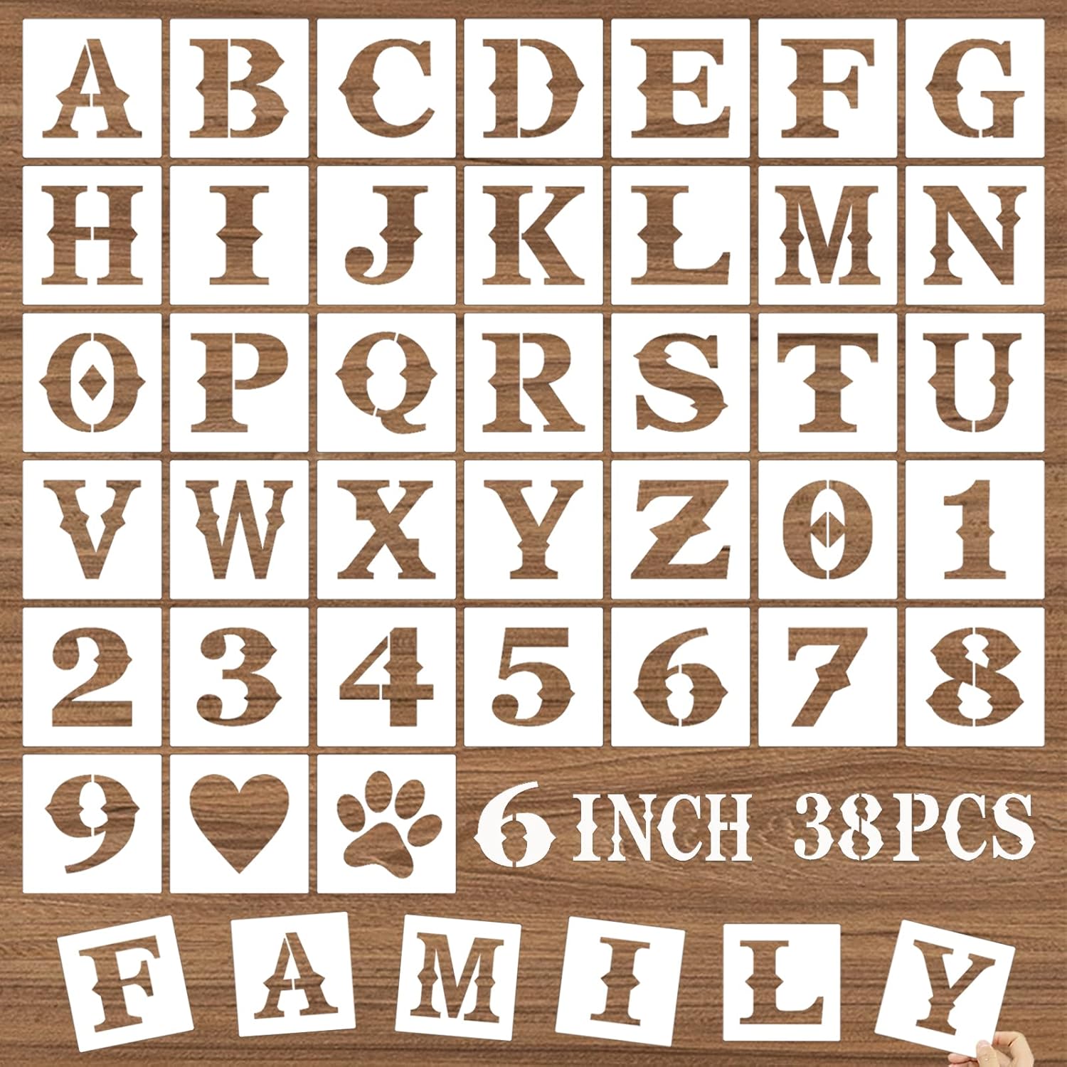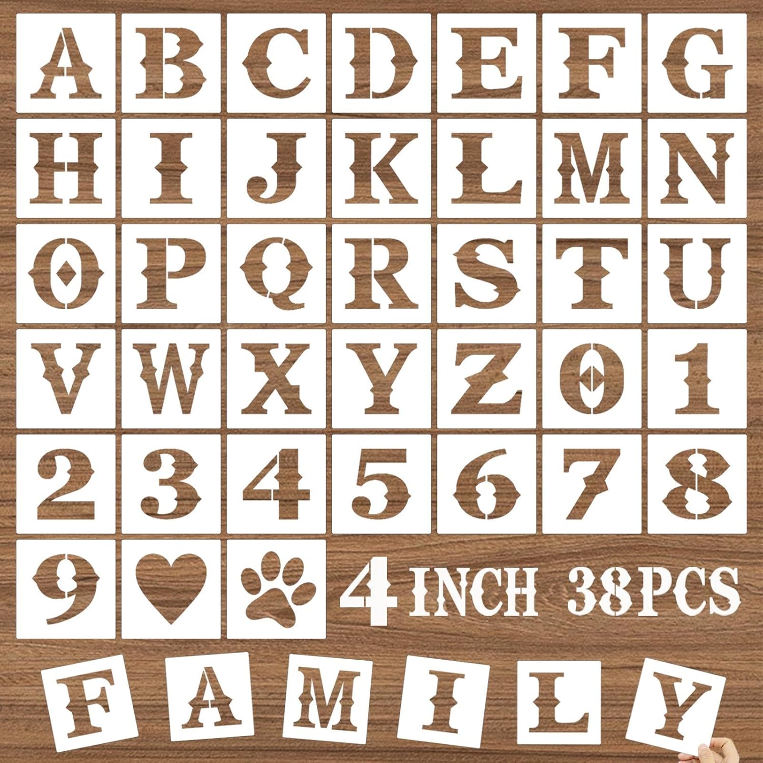 Specifications:Material: PET plasticColor: WhiteQuantity: 38piecesSize: as shown in the pictureWhy Choose Our Letter Stencils for Crafts Reusable?1.Translucent material, you can clearly see the painting pattern through the journal stencils template. Endless possibilities of customized words to inspire and create any DIY art project you want;2.Large enough patterns, moderate hardness with creative journaling stencils, no break, and avoid scratch.3.Ideal Choice for Gift----The letter stencils set can be offered as a gift to teachers, and your friends. 4.The letter templates are washable and reusable, you can use them with many different colors and as many times as you want, they are easy to clean after using, saving your time and energy, then you can store them in drawer conveniently.5.Wide Application-These stencils are ideal for DIY art projects, handmade crafts, painting, home decoration that can be applied to most flat surfaces including the wall, furniture, table, cabinet, tiles, floor, rock, canvas, fabric, metal, glass, wooden signs, bin, cards, album, wedding craft, etc.How to use?1. Clean the surface you wanna paint2. Fix the edges with adhesive tape to avoid bleeding3. Paint with brush,spray or pen4. Remove the stencil by lifting up one corner lightly5. Wash it immediately with soap water