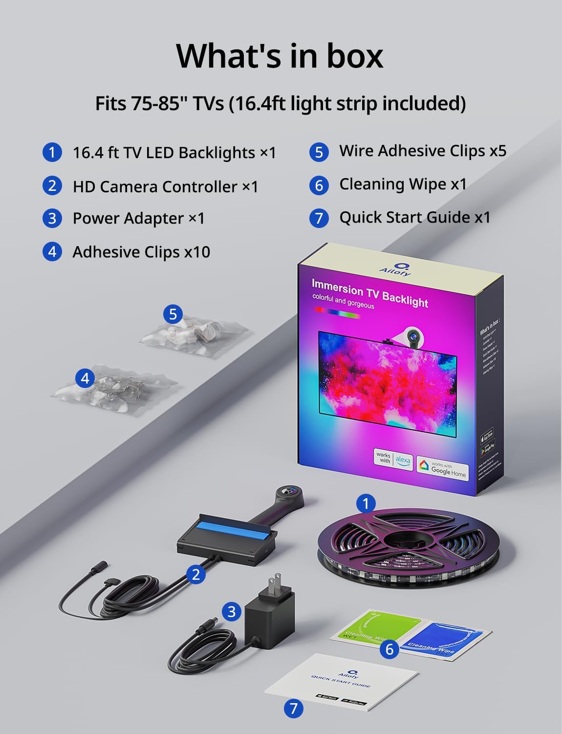 | Included Components | 16.4ft TV LED Backlights x1, HD Camera Controller x1, Power Adapter x1, Quick Start Guide x1, Wire Adhesive Clips x5, Adhesive Clips x10, Cleaning Wipe x1 |