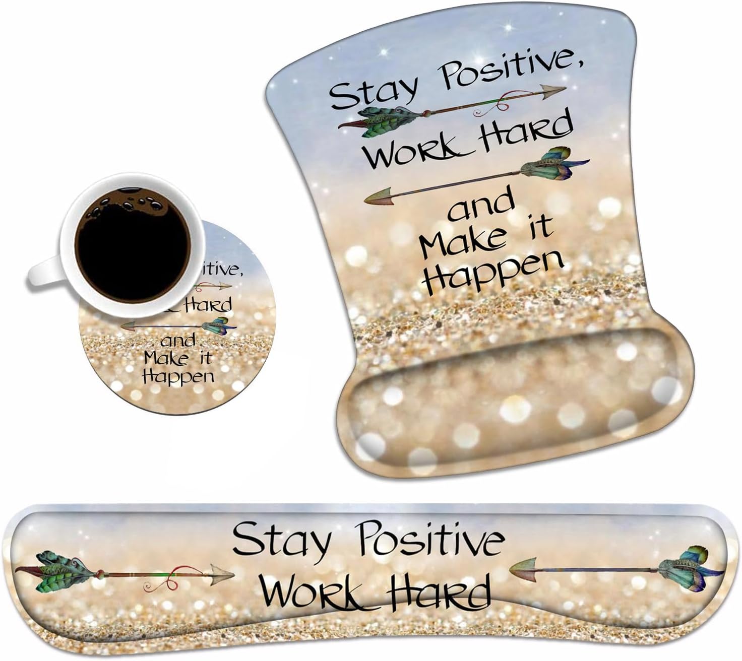 Ergonomic mouse pad with wrist support + keyboard wrist rests + cup coaster set for Home/Office/Work/Study👉 Are you looking for wrist rest mouse pad set with vivid images in bright color?👉 Do you want to get a PC accessory to prevent carpal tunnel issues?If Yes, we just solve your problems NOW, Gaming mouse pad with wrist support set is the right choice for you.Why You Choose Us☛ Wrist pad arc design fits the human wrist joints to keep the wrist in a natural and comfortable state.☛ Keyboard wrist & Mouse Wrist is made of cushioned neoprene, Non-toxic, no odor, harmless to health.☛ Allows more accurate and more fast mouse movement, and provides excellent point and click precision.☛ Non-slip rubber base provides heavy grip preventing sliding or unwanted movement.Suitable for different surface conditions.☛ High-definition printing, bright colors, easy to clean, not easy to fade.☛ Wrist support mouse pad with vivid printing, an exquisite attachment for home, office. An Ideal gift for families, friends, co-workers, etc.Product SpecificationMaterial: Comfortable Gel, Non-slip PU base and Lycra silky cloth surfaceWrist Filling Material: Memory formProduct Size: Mouse Pad Wrist Support ( 9.84" x 7.87" x 0.86" ); Keyboard Wrist Rest Pad ( 17.32" x 3.34" x 0.98" ); Coffee Coaster ( 4" x 4" x 0.08" )Package Included1 x Mouse Pad with Wrist Support1 x Wrist Pad for Keyboard1 x Cute Coffee CoasterNow, click "ADD TO CART" to get a worthy wrist rest pad set for mouse and keyboard.