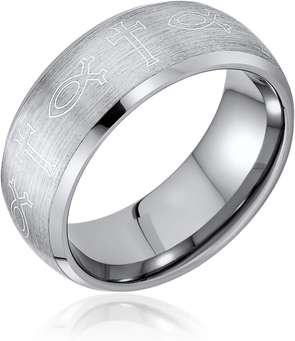 Discover our elegant black stainless steel spinner ring, perfect for religious jewelry lovers. Lightweight and stylish, it features the Lord's Prayer in Spanish. The inner band spins effortlessly, showcasing comforting words. Geometric edges create a striking two-toned look. A crucifix adds spiritual touch. Hypoallergenic and comfortable, it's 8mm wide. Ideal for Easter or Christmas gifts, symbolizing love and faith. Order one for a friend today!
