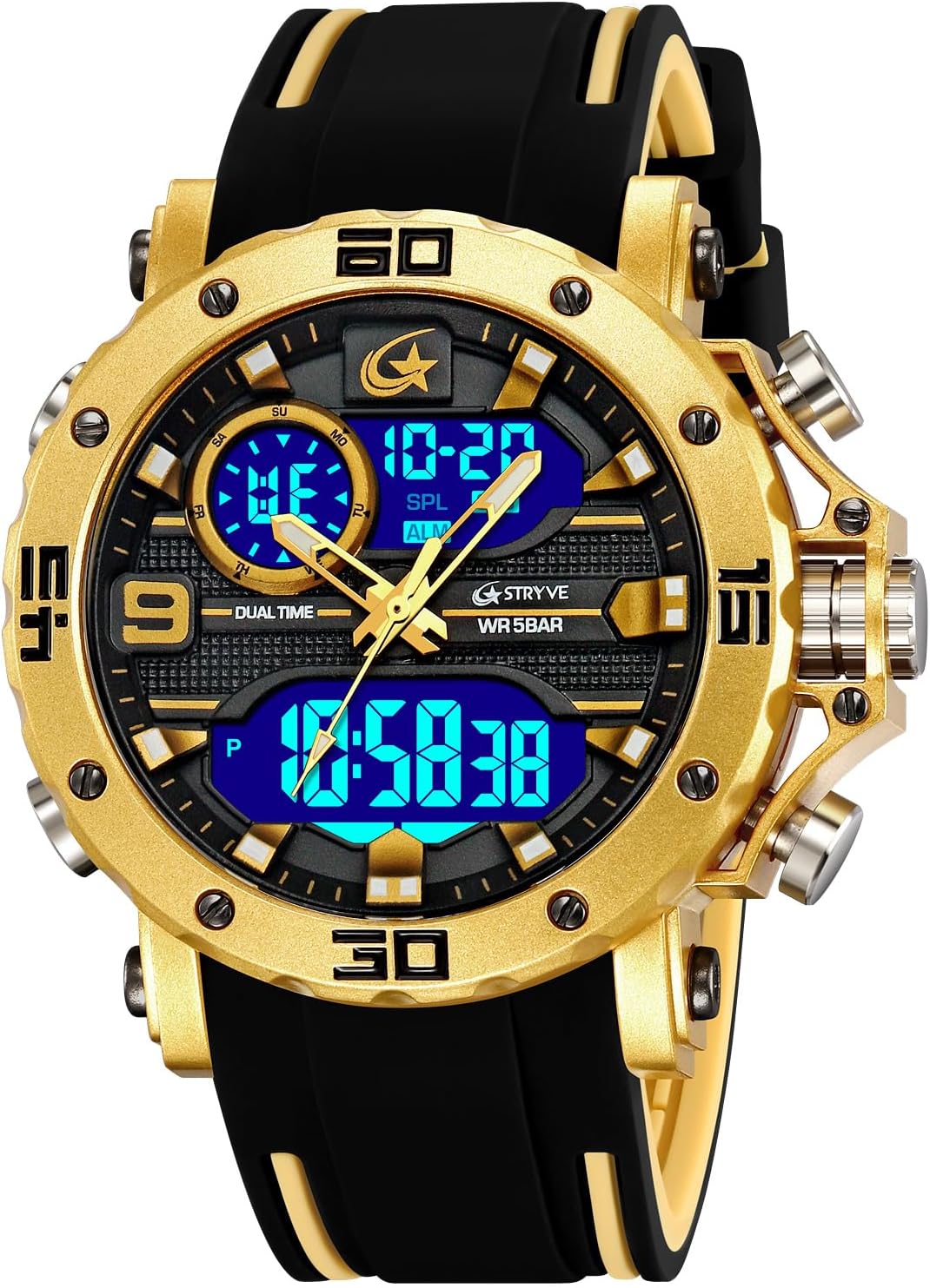 Check the size of the cool stylish men's watch carefully when you buy it, e.g. watch length, watch width, dial diameter and other sizes, and match it to your wrist size.Note the hard surface of the coated mineral glass and ABS shockproof case. Silicone band with buckle closureThis watch with the analog digital round dial for men's daily useFeatures:✔ Item shape: Round✔ Dial Window: Acrylic Mirror✔Display type: Analog-DigitalCase: ABSStrap: SiliconeWater-resistant depth: 50 MetersOur service:You can return the watch and packaging undamaged within 30 days, without any reason.If you have any questions or don't know how to adjust the watch time and band on this designer watch, please contact usWe will do our best to make sure that you have met us. We strive for a happy customer experience and highly value the customer's shopping experience.NOTE:1. Do not press any buttons under water. Avoid use in extreme hot or cold temperatures.2. Highly recommended to clean the handle with a soft cloth on a regular basis.3. Too much contact with water will shorten the life of the watch.Time Display Type: Analog-Digital Dial Case Diameter: 1.99*2.07"(50.6*52.7 mm) Dial Case Thickness: 0.67"(17.2 mm) Band Width: 0.94"(24 mm) Band Length: 10.04"(255 mm) Band Clasp Type: Buckle Watch Weight: 2.5oz (70.8 g)