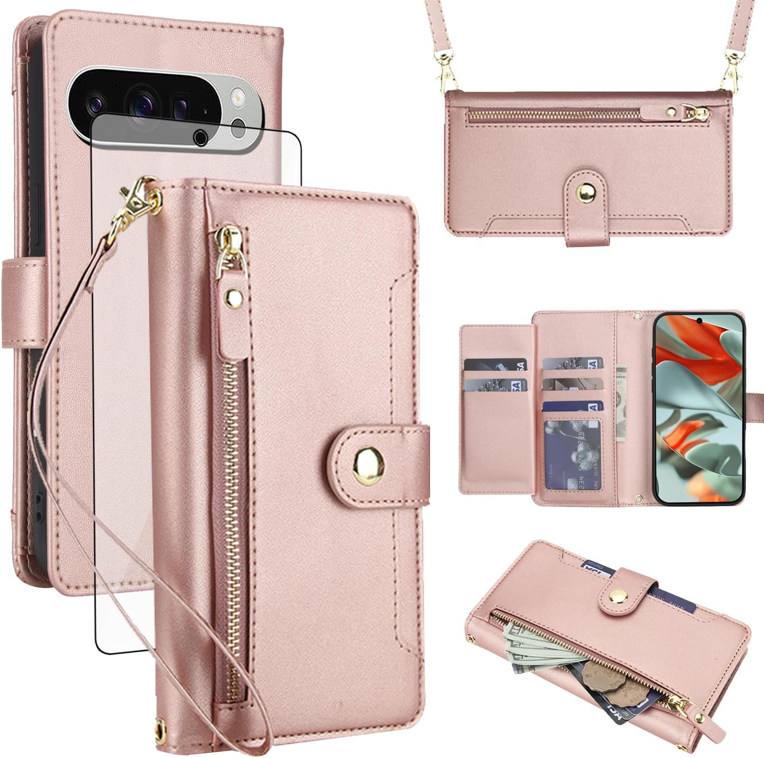 Asuwish Phone Case for Google Pixel 10 Pro XL Zipper Wallet Cell Cover, with Tempered Glass Screen Protector and Crossbody Wrist Strap, Credit Card Holder Pixel10 10Pro 10ProXL Ten Women Girls Brown