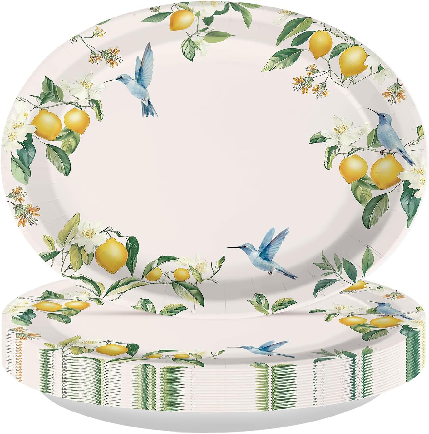 50 PCS Purple Floral Oval Paper Plates 10" x 12" Large Heavy Duty Disposable Watercolor Flower Butterfly Plates for Birthday Wedding Bridal Baby Shower Party Decorations