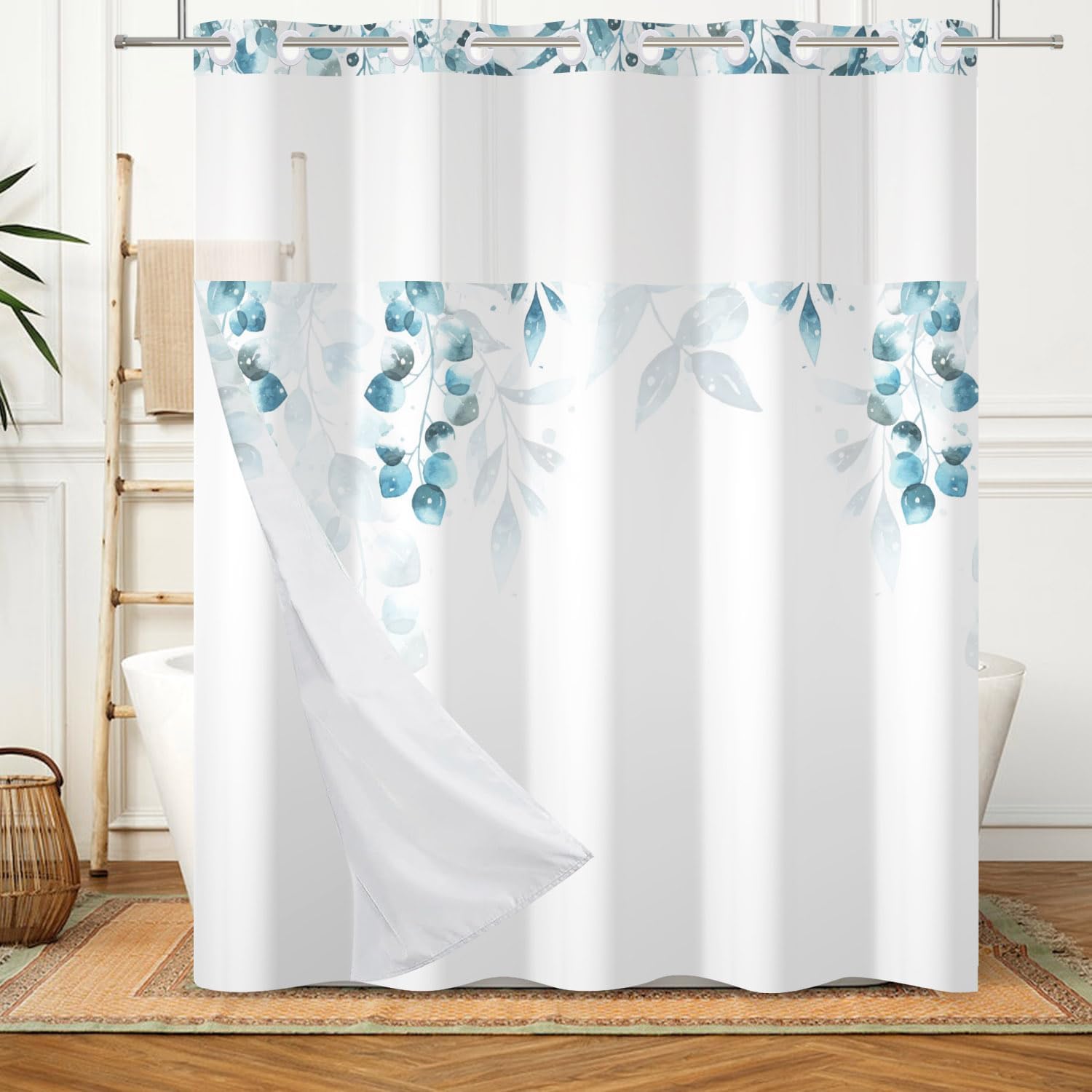 • Shower Curtain and Liner: This no hook shower curtain and liner set is made of 100% polyester waterproof fabric, without fading, liner with white snap switch, The snap-on fabric shower curtain liner is easily detachable and clean