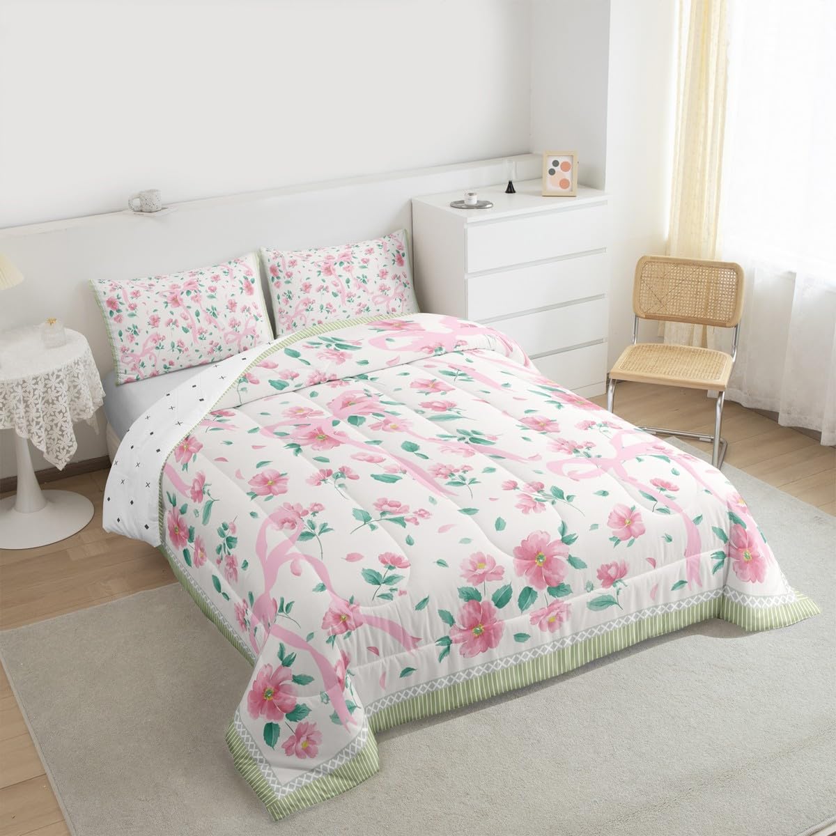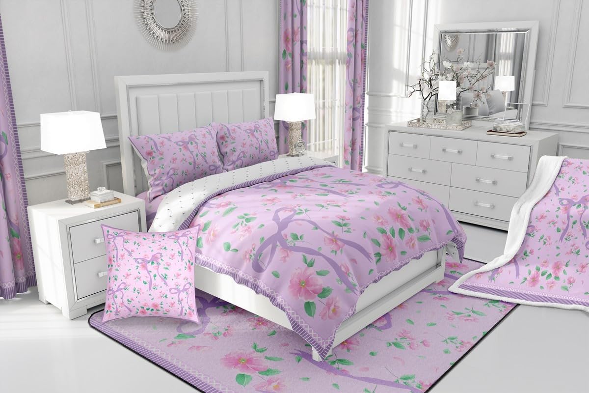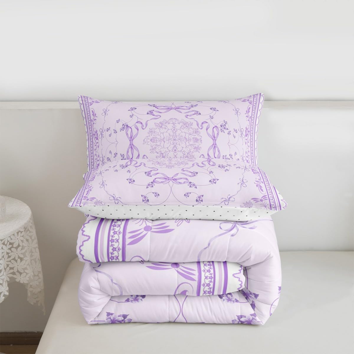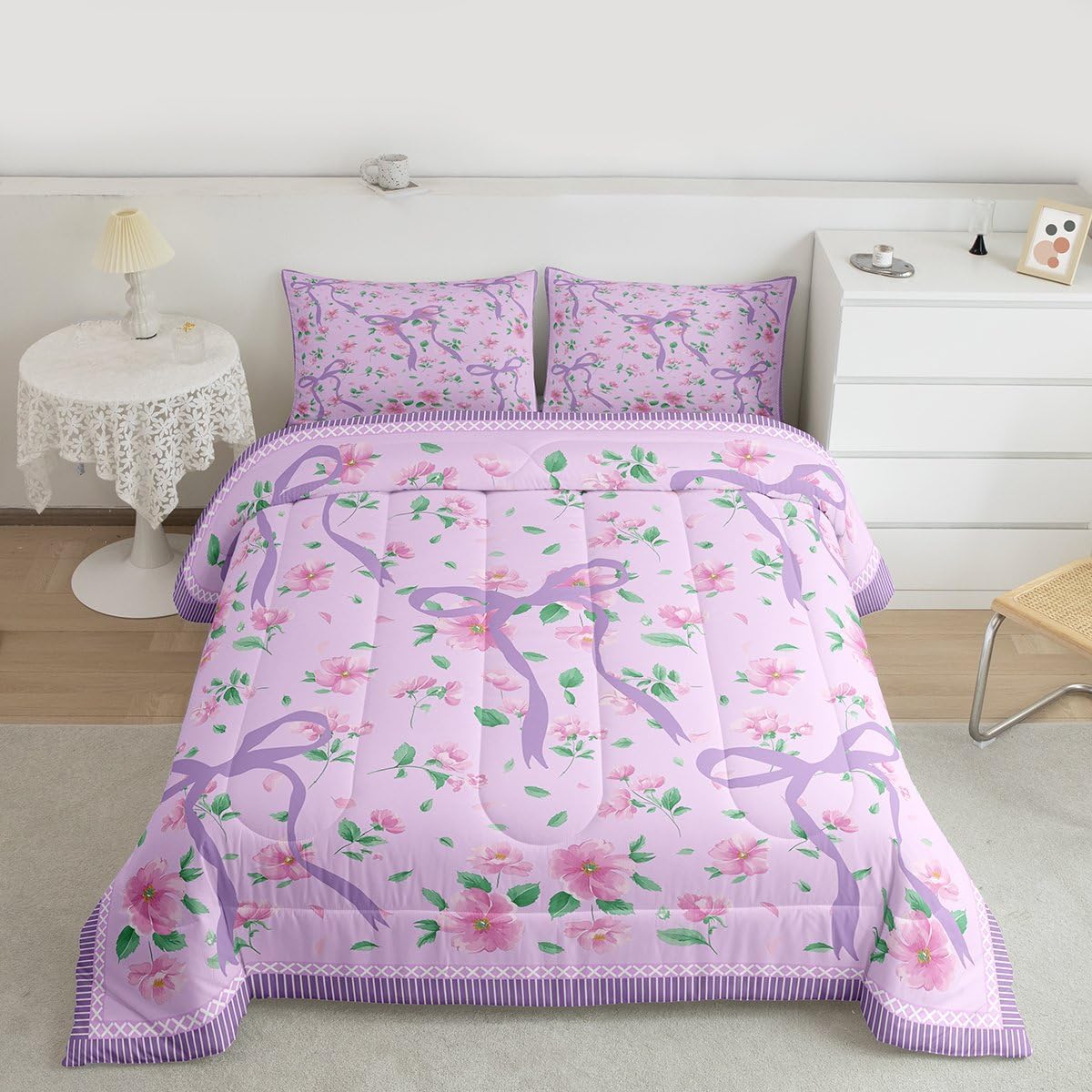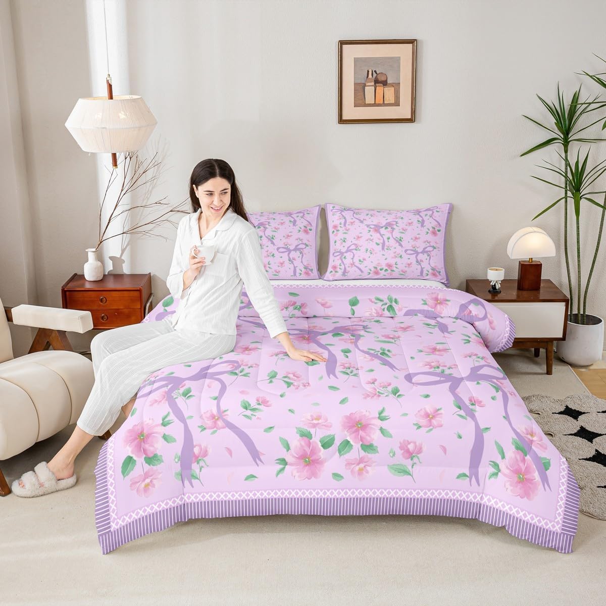 Erosebridal Purple Bow Twin Comforter Set for Girls,Floral Coquette Bowknot Bedding Set Bow Tie Bohemian Quilt Farmhouse Preppy Room Decor Vinatge Watercolor Bows Botanical Aesthetic Bed Set
