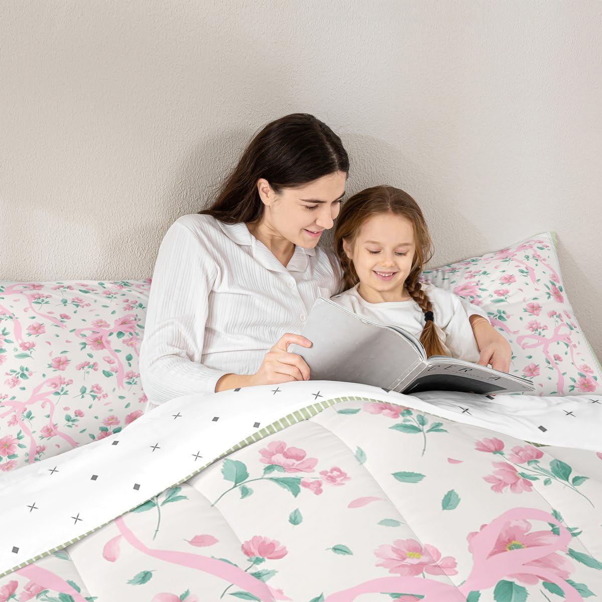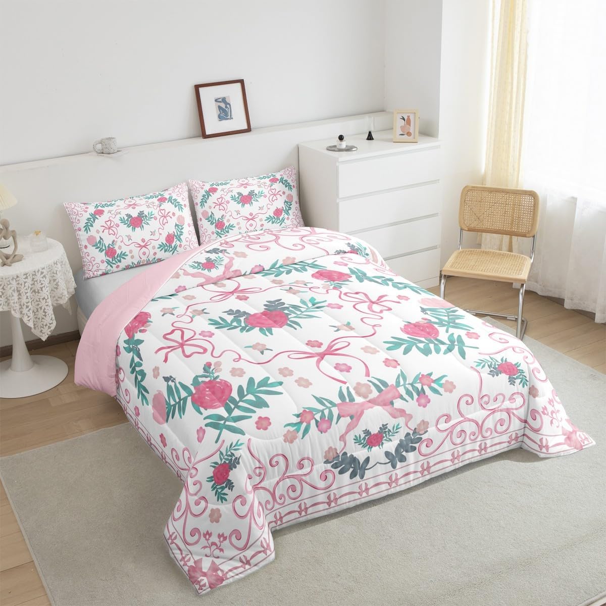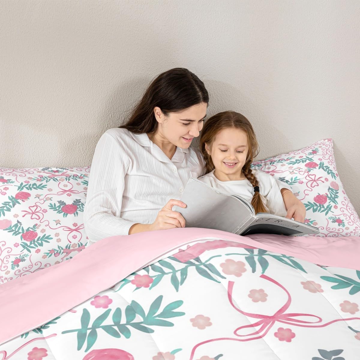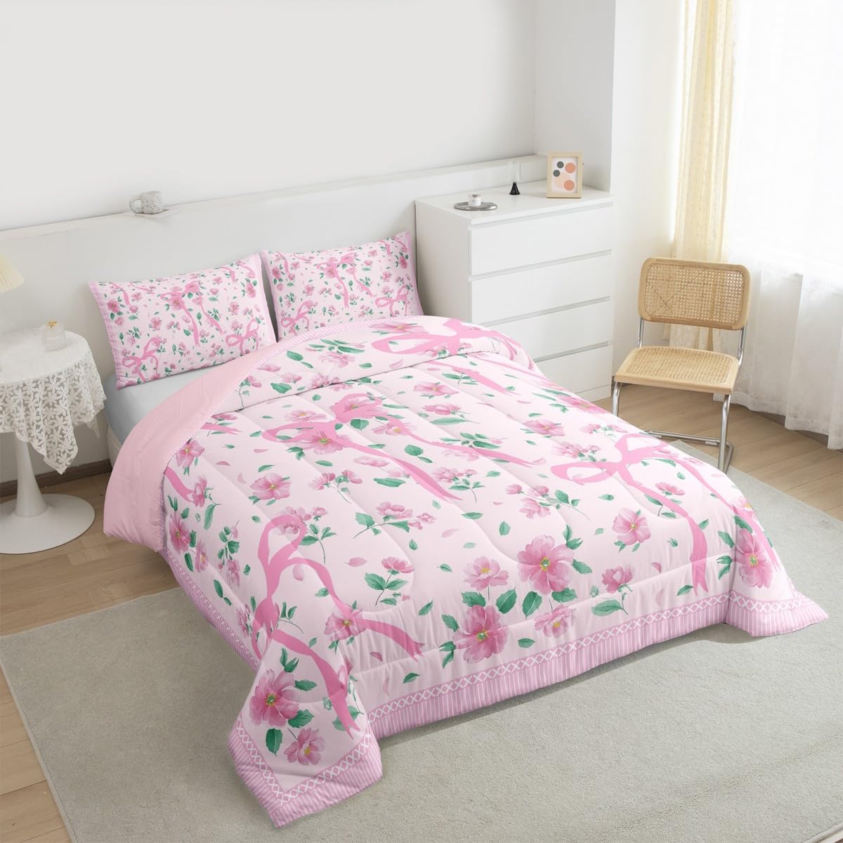 Erosebridal Purple Bow Twin Comforter Set for Girls,Floral Coquette Bowknot Bedding Set Bow Tie Bohemian Quilt Farmhouse Preppy Room Decor Vinatge Watercolor Bows Botanical Aesthetic Bed Set