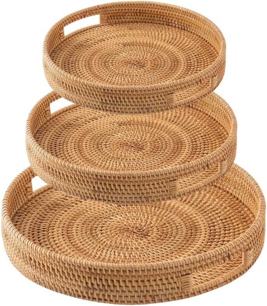 Features:*High-quality Material: This serving tray is made of rattan, its durability and reliability. It is hand-woven and features built-in handles for easy carrying and serving.*Natural Rustic Design: With its natural rustic color and simple yet elegant design, this round tray adds a touch of sophistication to any home, kitchen, farmhouse, tea room, or coffee room.*Versatile Functionality: This multifunctional tray can be used as an ottoman, coffee table, or side table tray. It is also perfect for serving food, drinks, or fruits.*Convenient Storage Solution: Besides its serving function, this tray can be placed on a tabletop or used as a centerpiece on a kitchen island. It is great for holding keys, mail, remote controls, plants, napkins, salt and pepper, and other small items.*Easy to Clean: The rattan material makes this tray very easy to clean. wipe it clean with a damp cloth, and it will be ready to use again.Specifications:*Part Name:Rattan Woven Tray*Material:Rattan*Size:25x25x4.5cm; 30x30x5cm; 35x35x6cm*Color:As Picture ShowPackage Content:1x Rattan Woven Tray
