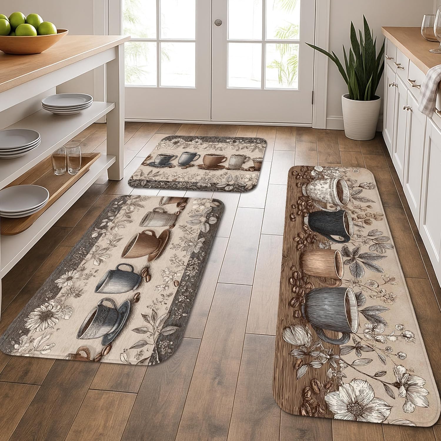 Vintage Kitchen Mats for Floor, Coffee Cups Floral Memory Foam Rugs, Cushioned Comfort Washable Non Slip Decor for Kitchen Sinks Laundry Room Bathroom 2PCS
