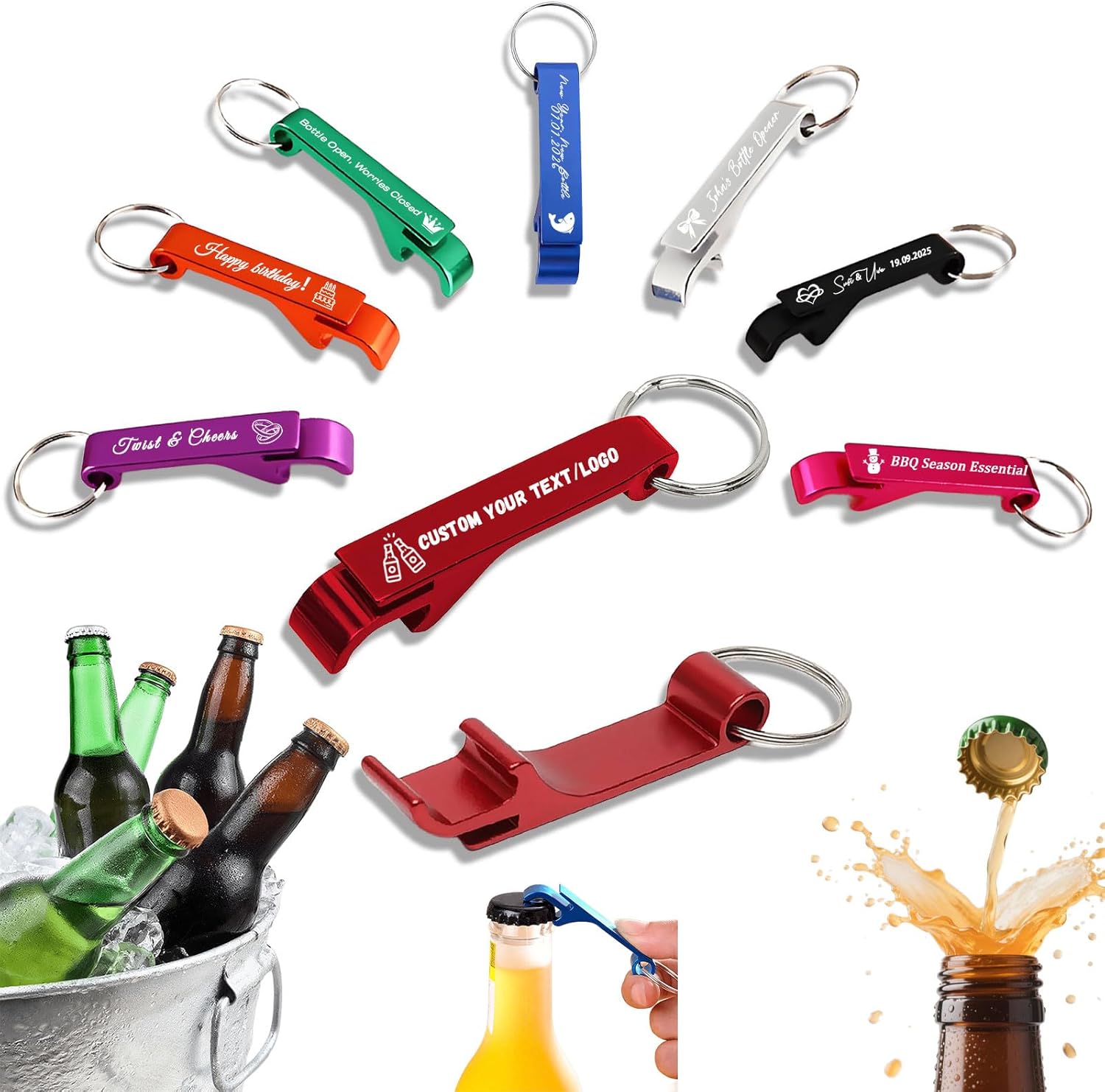 This compact bottle opener, crafted from durable aluminum alloy, easily handles a wide variety of bottle caps and maintains its shape over time. Its clever design allows for portability, perfect for hanging on keys or carrying on a backpack. Its versatile function makes it both a bottle opener and a key manager. Customizable with personalized engraving or logos, this practical tool carries your precious touch, making it a memorable everyday companion or gift for a loved one!
