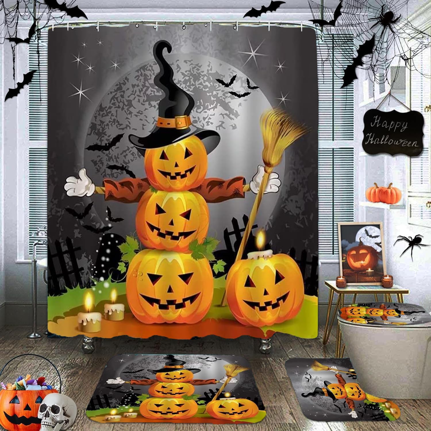Description: shower curtain will bring your bath a more festival atmosphere. elements as haunted house, pumpkin and witch, to create a knockout and spooky scene. Also makes a fun addition to your party. Your bathroom will be filled with a novelty festival atmosphere. Size Infomation: The shower curtain: 70.8" L × 70.8" W The bathroom mat: 39.5" L × 17.7" W The toilet lid cover: 17.7" L × 13.8" W The U shape rug: 17.7" L × 14.8" W 12 pcs shower curtain hooks for easy installment Warm Notices: Machine washable, gentle cycle, tumble dry low. Do not bleach or tumble dry. Please iron it at a lower temperature. The measurement may have 1-3cm (0.39-1.18inch) inaccurate errors. There might be slight colour deviation due to different displays.