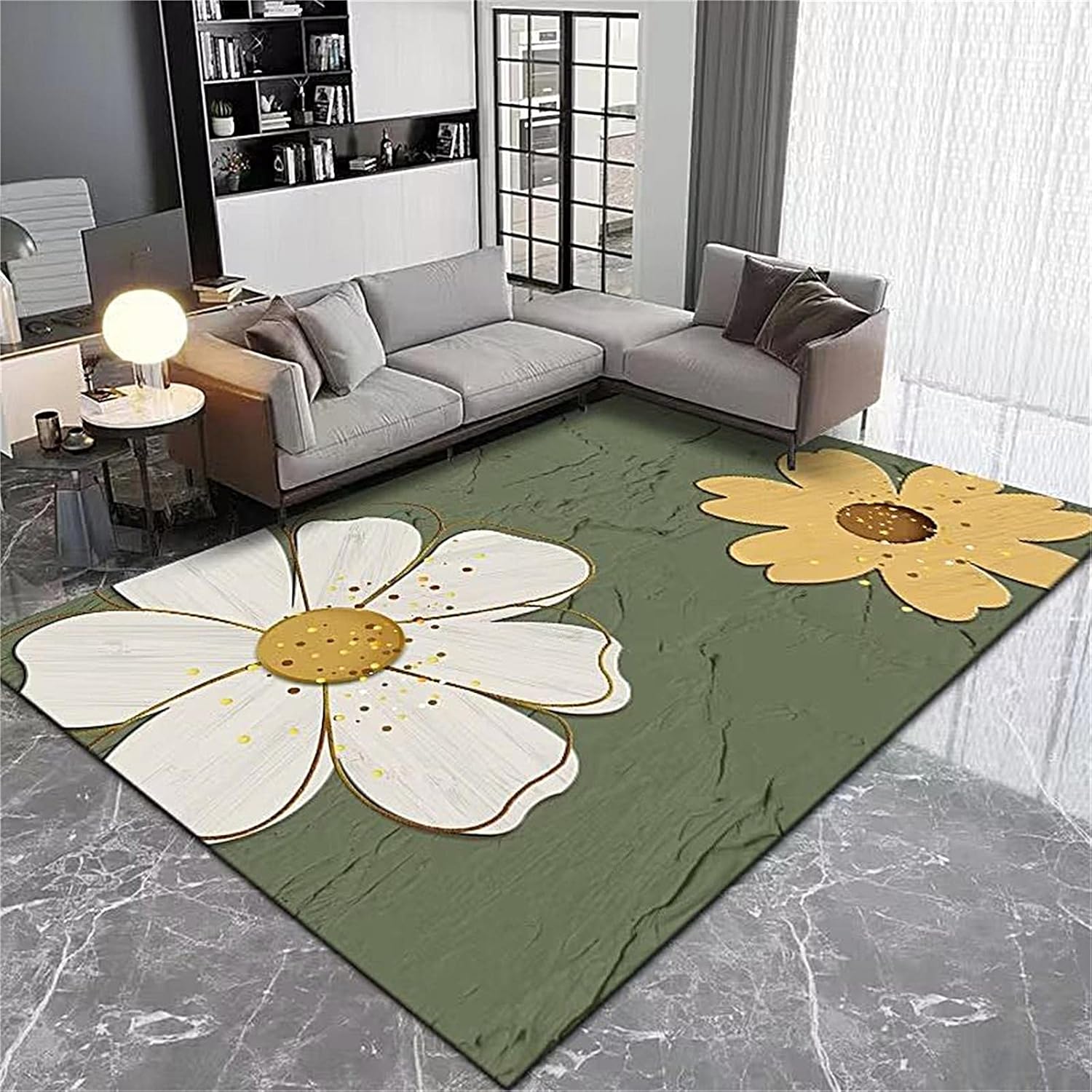 Introducing our beautiful and stylish floral area rug, perfect for adding a touch of modern art decor to any space. Features of modern floral area rugs: 🌷With its gorgeous white daisy floral design set against a green leaves background, this area rug is sure to brighten up any room, from your living room to your kitchen.🌷Made from high-quality materials, our elegant daisy carpet is durable and long-lasting, ensuring it will look great for years to come. It's perfect for adding extra comfort and warmth to your floors.🌷The bottom of our decorative rugs for living room is made of dot plastic anti-slip base, which has good anti-slip performance, does not stick to the floor and does not turn yellow.🌷The edges of this floral print rug are tightly overlock-knitted for strength and durability, ensuring the edges won't come apart when washed.🌷This modern flowers rug is also versatile, fitting into a wide range of decor styles, whether you're looking for a floral aesthetic or something more contemporary. It's perfect for adding a pop of color to your bedroom or living room.🌷Perfect for a girl's bedroom, this floral kitchen mat not only offers a lovely white daisy design, but it also adds a touch of childlike fun and joy without compromising on quality or style.🌷For a boy's bedroom or other space, we also offer a 3d floral cushion in a modern daisy floral decor design. This rug is perfect for adding a pop of color and texture to your space.🌷Furthermore, our floral pattern rugs are crafted to perfection, the real object and the picture can reach 95% similarity.🌷Overall, this rug is a great addition to any home, offering quality, style, and versatility. Care instructions:①. Wash separately, avoid soaking for more than 30 minutes.②. Machine wash cold or hand wash. Gentle cycle.③. Do not bleach. Dry at low temperature. Hang to dry in a cool dark place.Warn:1. The modern floral area rugs are vacuum-compressed and packaged separately, but it will recover after a day or two, which does not affect the use.2. Follow the washing instructions to wash. Do not expose to the sun after washing.3. If you find a peculiar smell after receiving the product, please expose it to the air for a period of time​​​​​​​.About chromatic aberration:Lighting, shooting technology, computer monitors, mobile phone screens, product batches and other factors will affect the color, which may cause slight differences between the picture and the actual color of the product. Please refer to the actual color received.