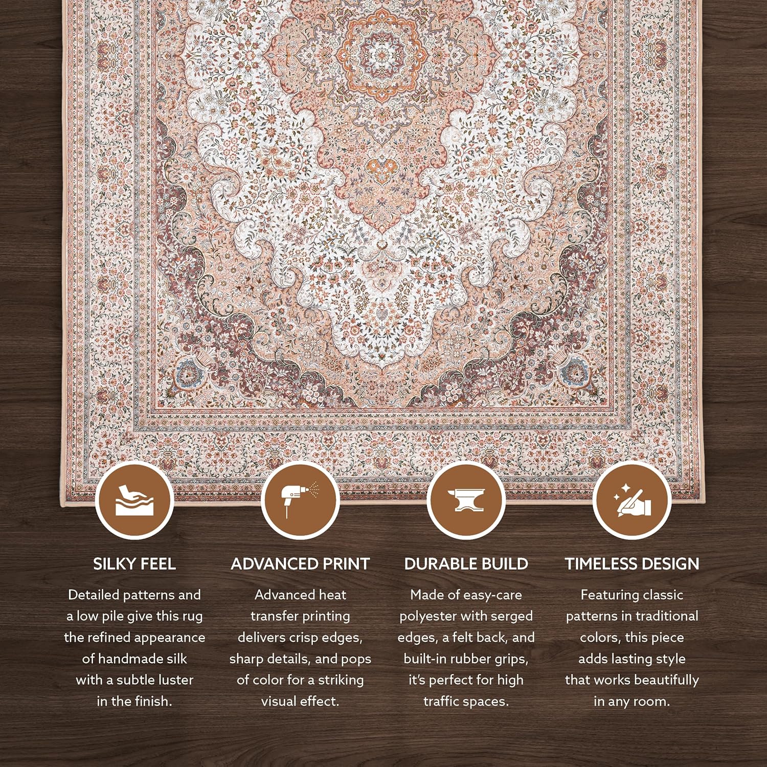 Low pile and detailed design give this rug the look and feel of handmade silk. A floor covering that offers timeless style, it features a classic pattern and traditional colors. Cutting edge technology applies a new heat transfer design process, delivering sharp, lively details with crisp edges and pops of color. The result is a silky but still affordable rug bound to beautify any room. Part of a multi size, multi color collection, each rug is made from easy care polyester.