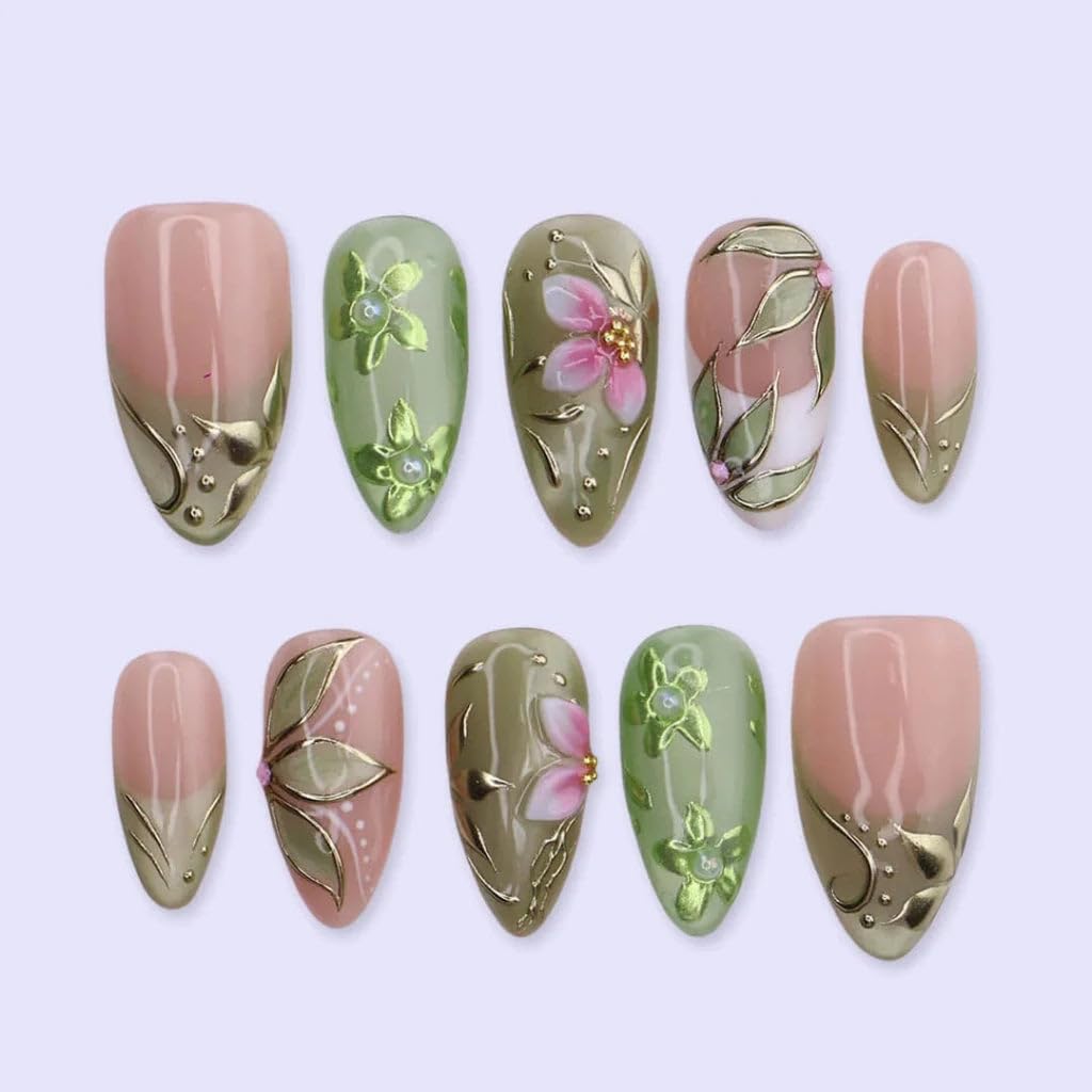 Welcome the ultimate season of rebirth with our flagship design from the Spring Collection. These Handmade Enchanted Spring Press On Nails offer a magical, wildly unique take on spring florals. Meticulously handcrafted by master nail artisans, each almond fake nail features a completely unique, mismatched ecosystem. The set beautifully captures nature's awakening with hyper-realistic 3D sculpting: a lifelike green frog, vibrant red toadstools, a blooming white lily, and a lucky ladybug. Layered over complex earthy textures like wood grain, fresh spring moss, and clear 3D morning dew drops, this eccentric set is the perfect statement piece for nature lovers stepping into the new season.