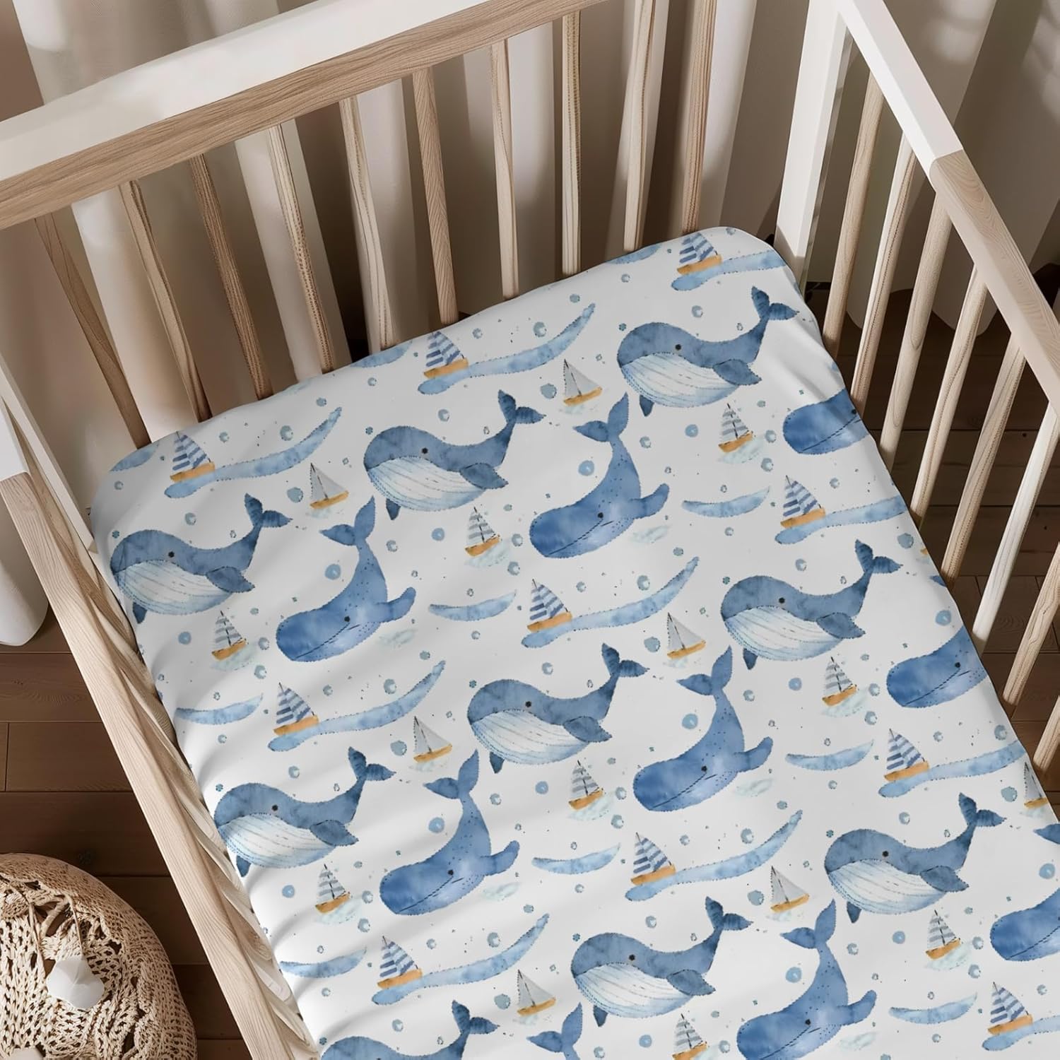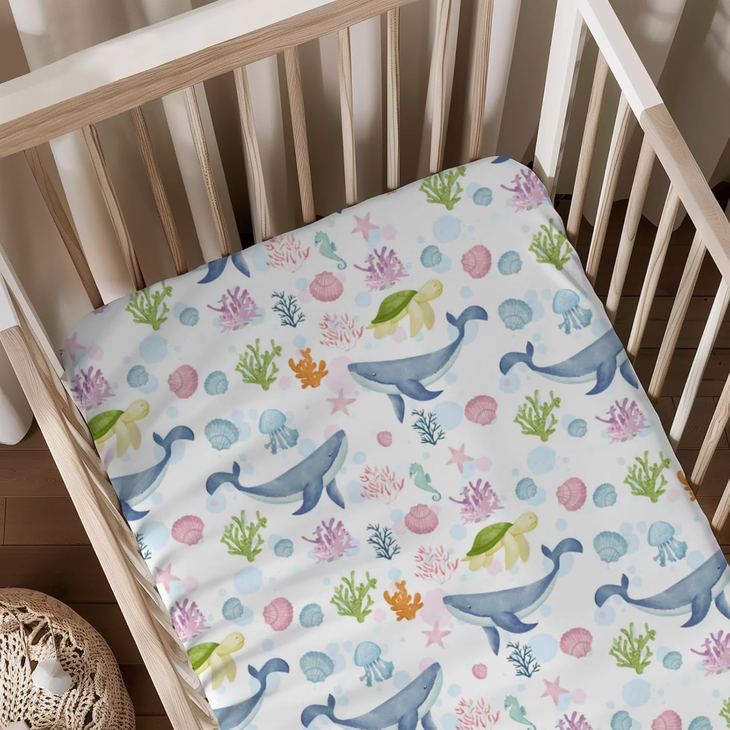 Watercolor Ocean Whales Sea Turtle Starfish Seashells Pattern Baby Sheets for Crib, Unisex Sea Animals Nursery Fitted Bed Sheet for Boys Girls Standard Crib and Toddler Mattress-28x52