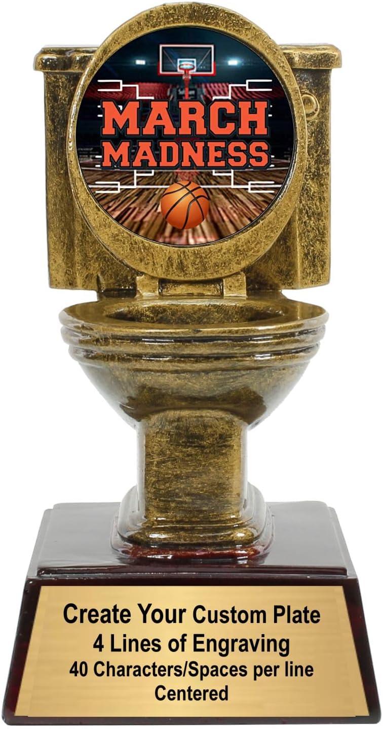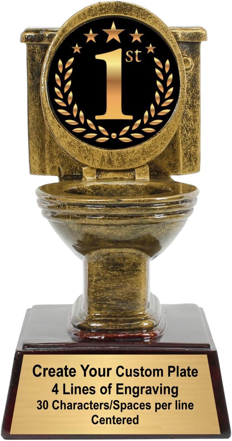 The Decade Awards Gold Toilet Bowl Trophy is 6" tall. It is a humorous way to call out those who ended up the season floating in the dreaded toilet. Recognize those who tanked the season and now sit last place in any league, game or event with this golden throne. Also an wonderful gift for a plumber or apprentice, potty training achievement or school bathroom pass. This great trophy our newest epoxy dome specifically made for those who lose so badly, that you must make an example of them.Create a PERSONALIZED message with three (3) lines of engraving; 30 (thirty) characters and spaces per line on a gold finish engraving plate .The trophy will arrive with the plate attached to the base. Simply click on the CUSTOMIZE NOW button to create YOUR special message to the recipient of this award. Celebrate Life’s Victories with Decade Awards!